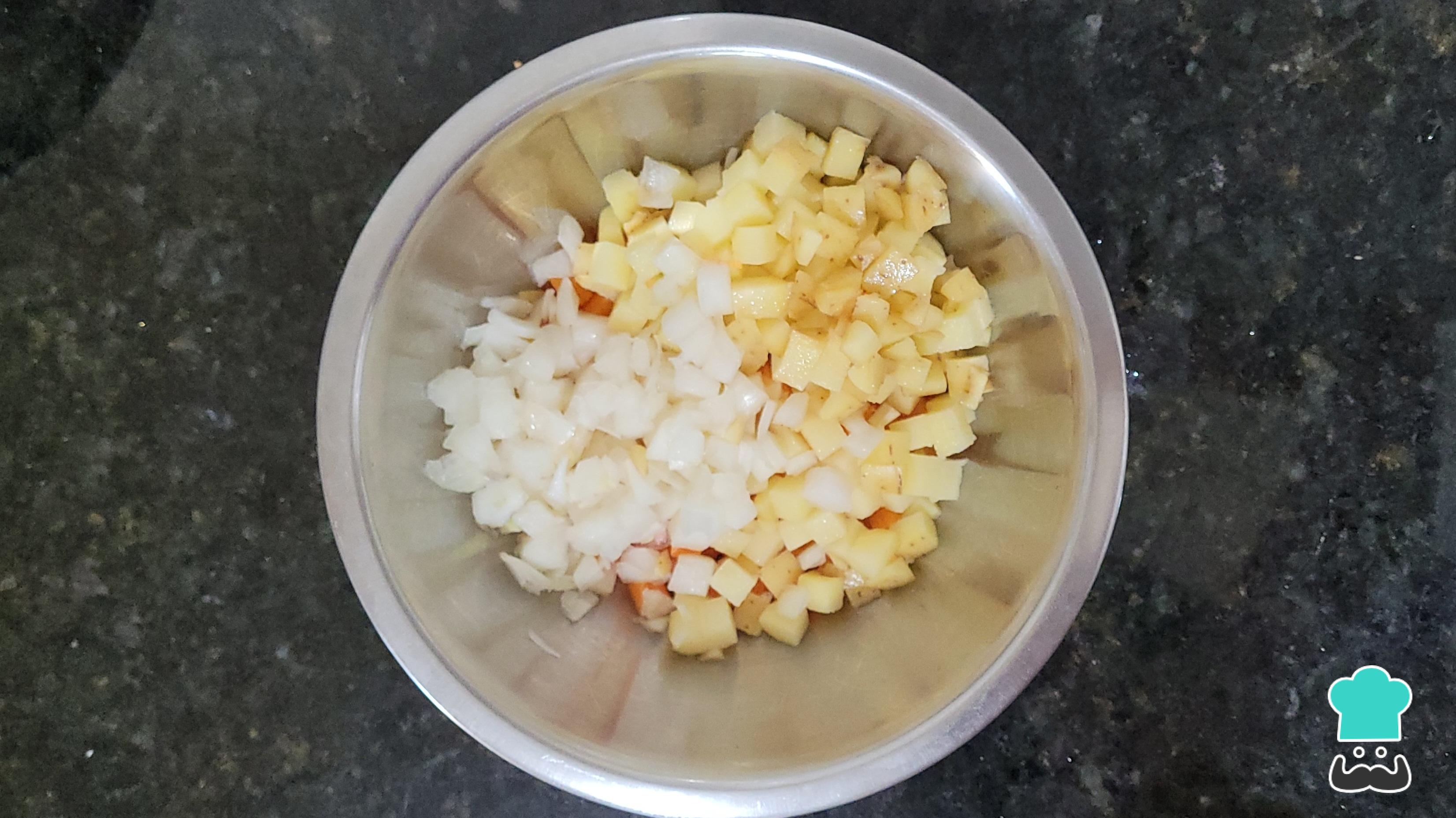 Em outro recipiente, coloque a cenoura, a batata e a cebola.