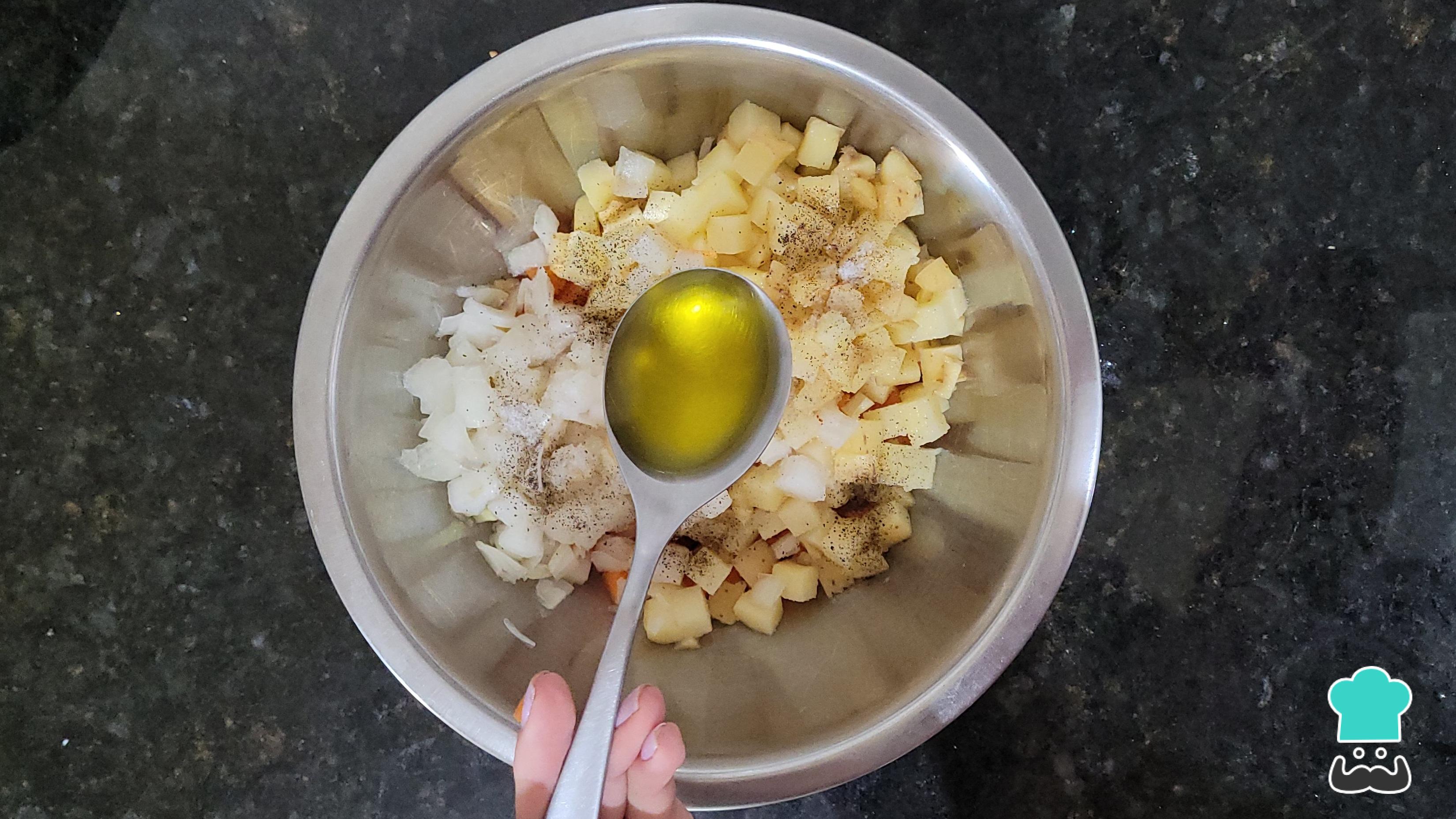 Adicione os temperos (sal, pimenta-do-reino e lemon pepper) e o azeite. Misture até que os legumes estejam cobertos por eles.