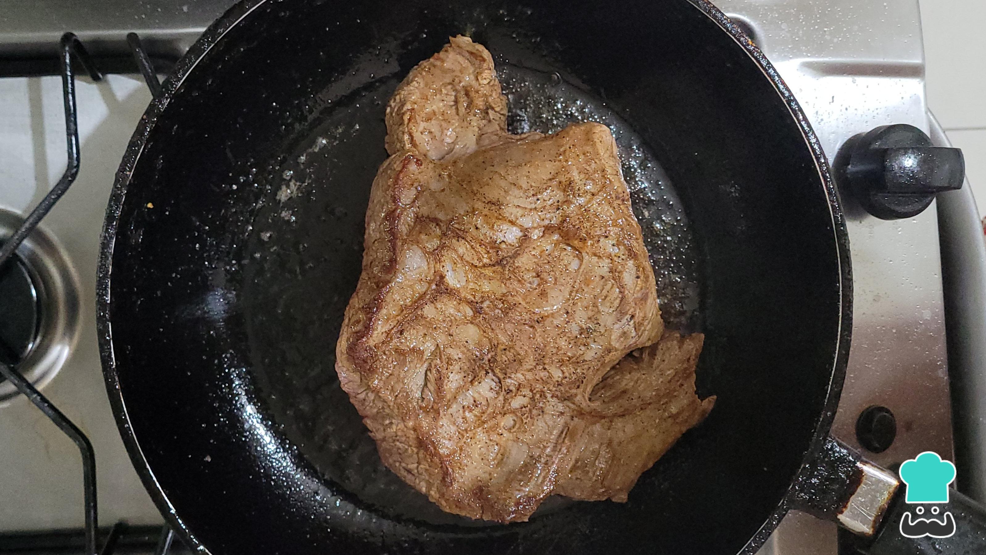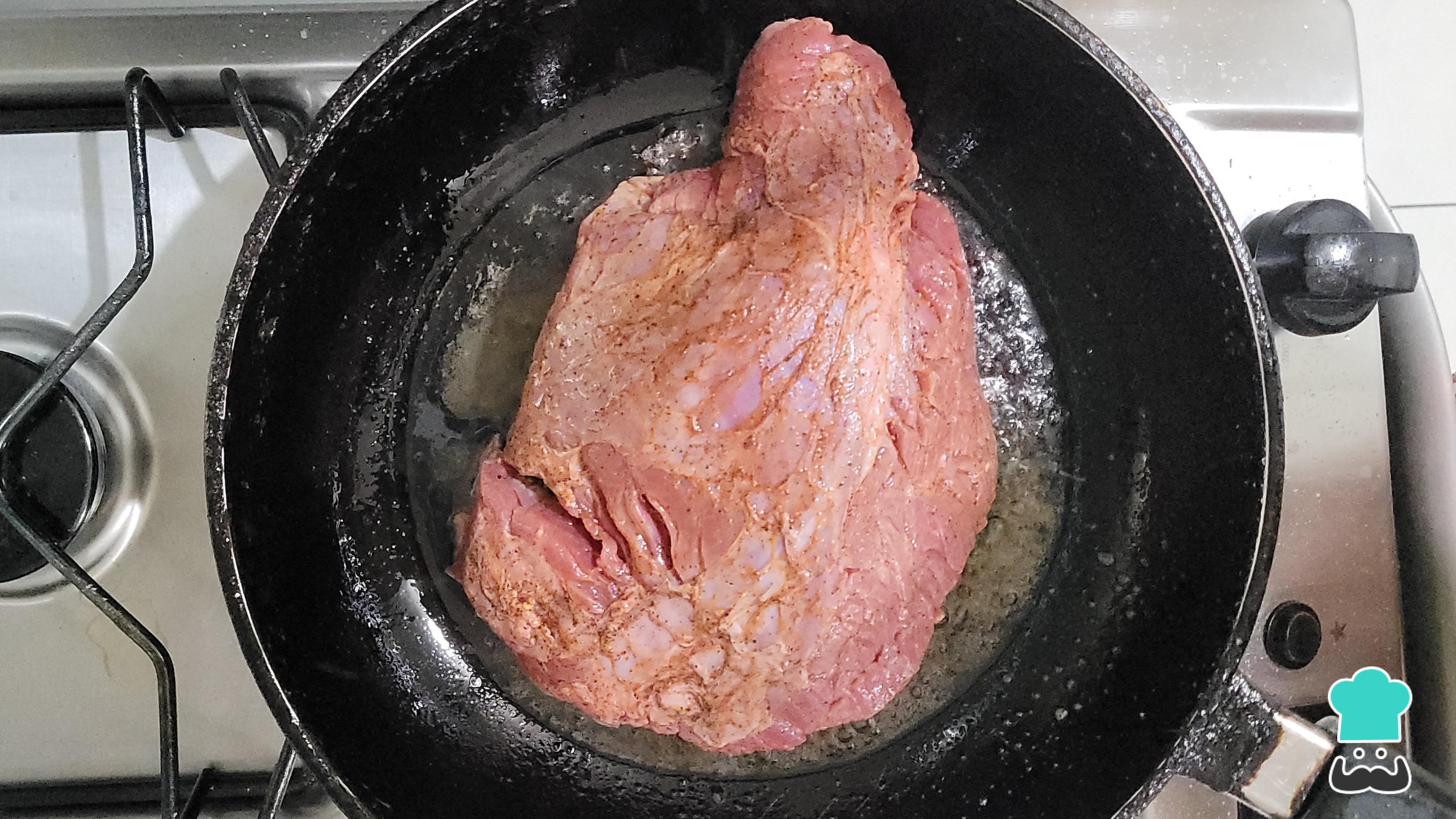 Na frigideira, coloque o óleo e deixe esquentar. Em seguida, ponha o acém e deixe selando por 3 minutos.