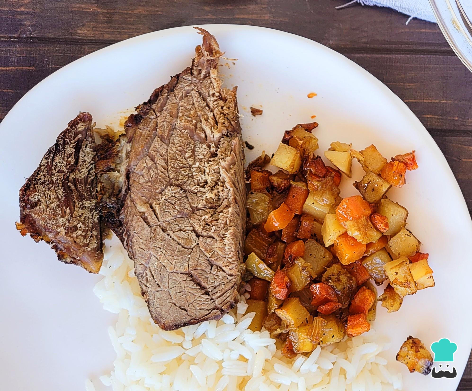 Apesar de prática, essa receita só precisa de planejamento porque o preparo demora quase 3 horas. Mas, garanto que a espera vale a pena, porque a carne fica saborosa e os legumes no ponto, basta completar com arroz ou salada. Também é possível fazer esse acém assado no forno com batatas.