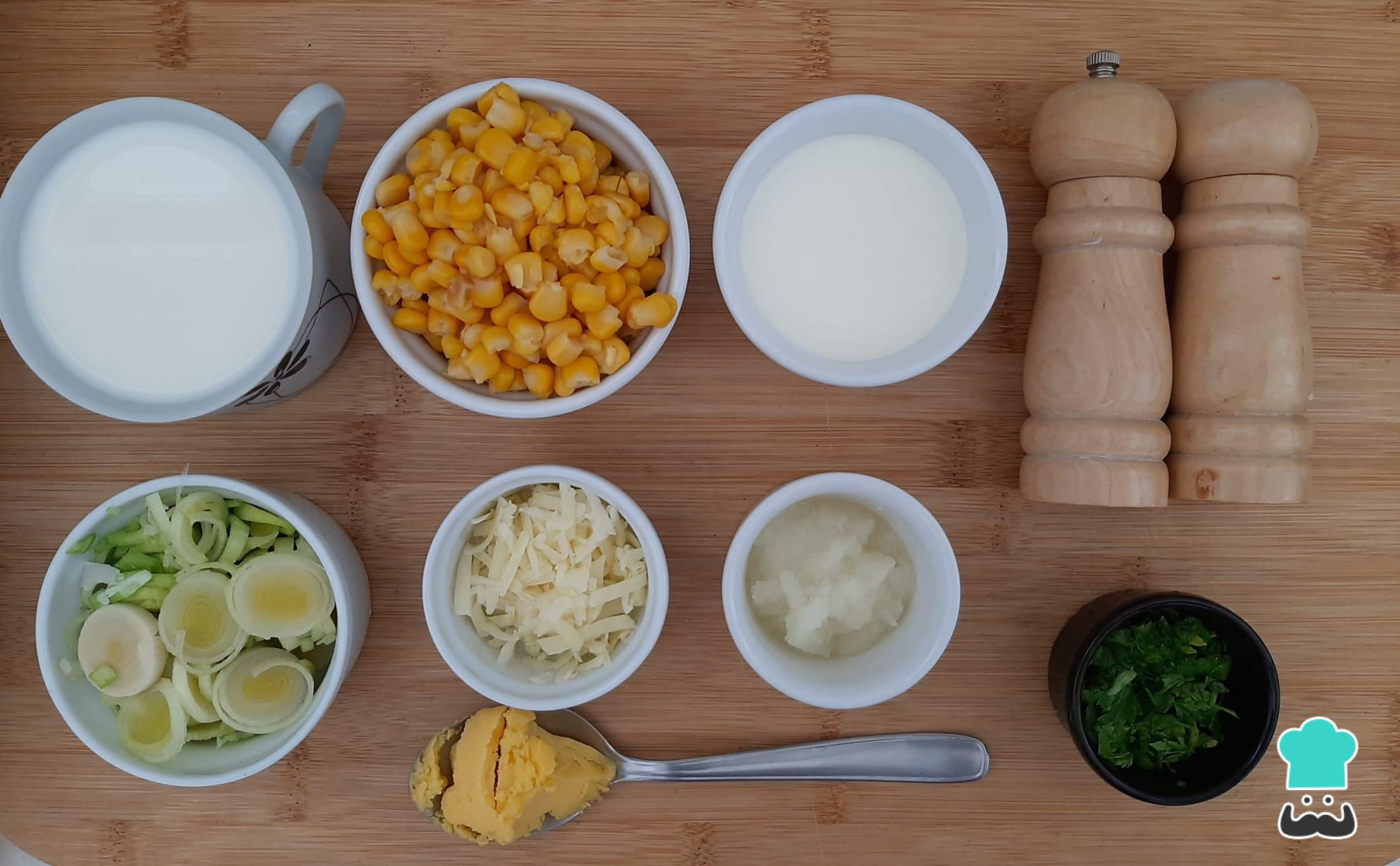 Separe todos os ingredientes necessários para preparar o creme de milho com alho poró para servir de acompanhamento para coxa de frango assada.