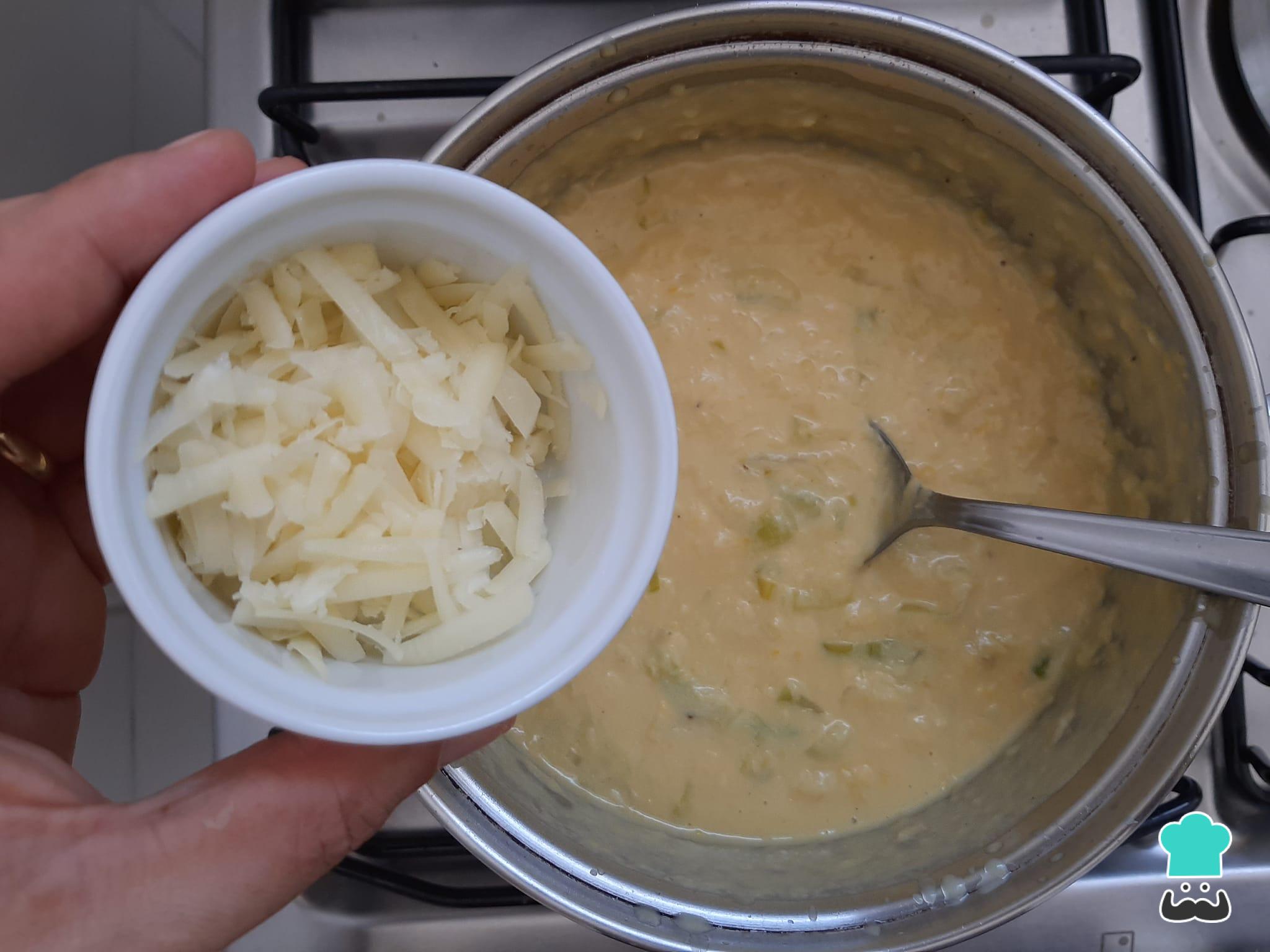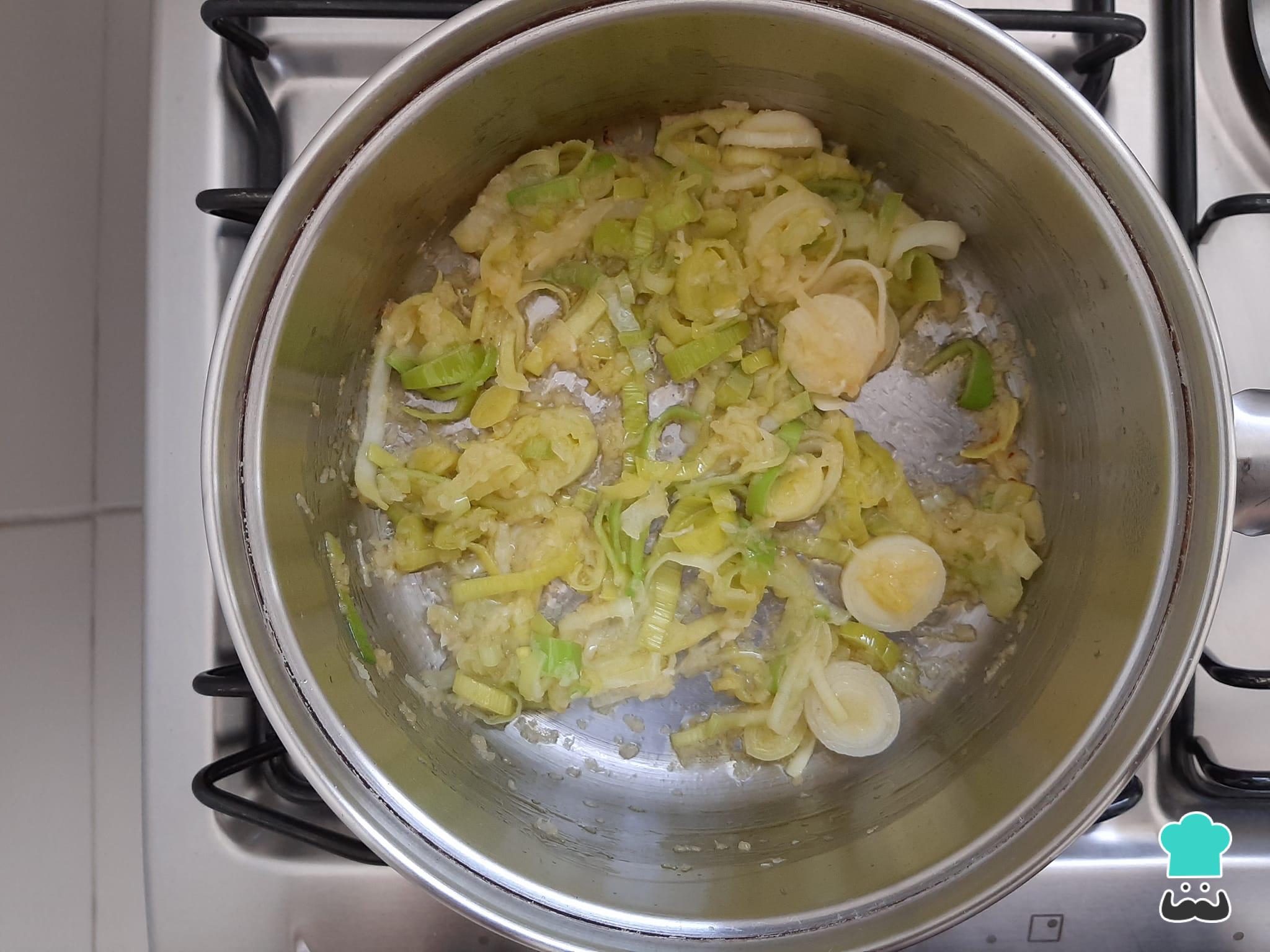 Numa panela média, derreta a manteiga e refogue a cebola ralada e em seguida o alho poró em rodelas por alguns minutos.