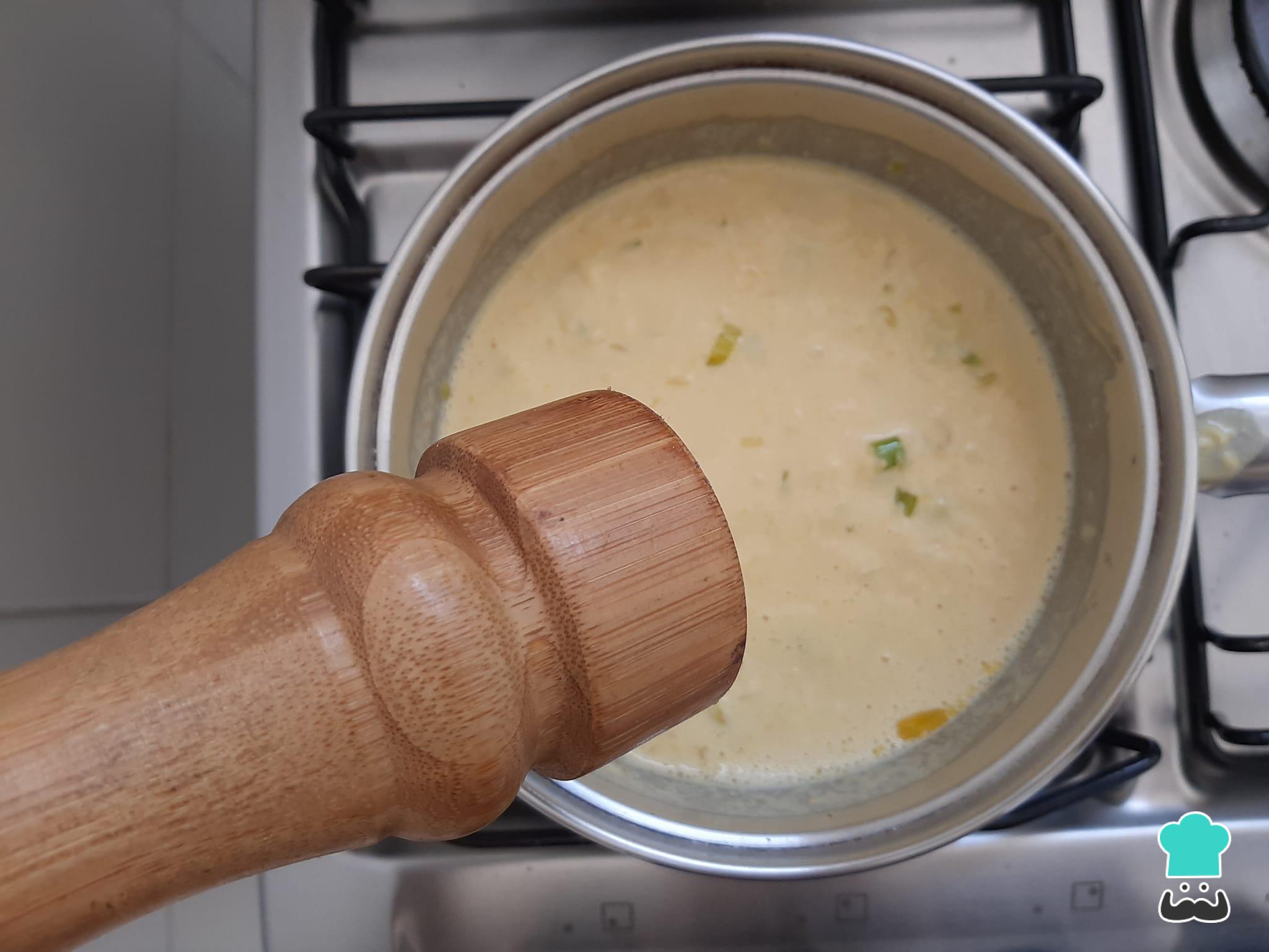 Junte o creme de milho batido anteriormente a este refogado e tempere-o com sal e pimenta do reino.