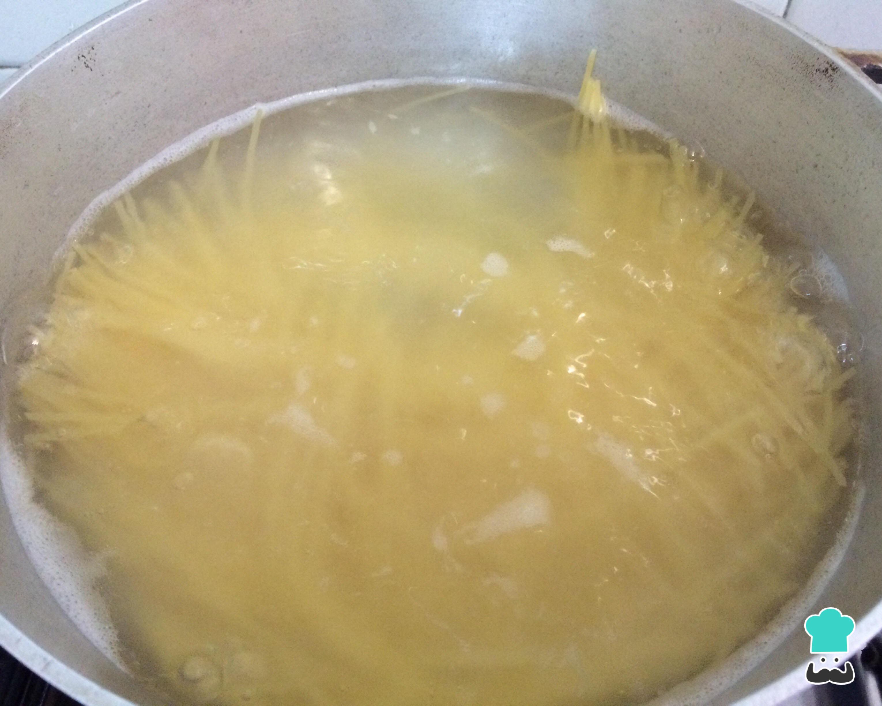 Cozinhe o espaguete numa panela com água fervente e um pouco de sal por 7-8 minutos ou até ficar al dente (nem cru nem muito mole). Escorra e reserve.