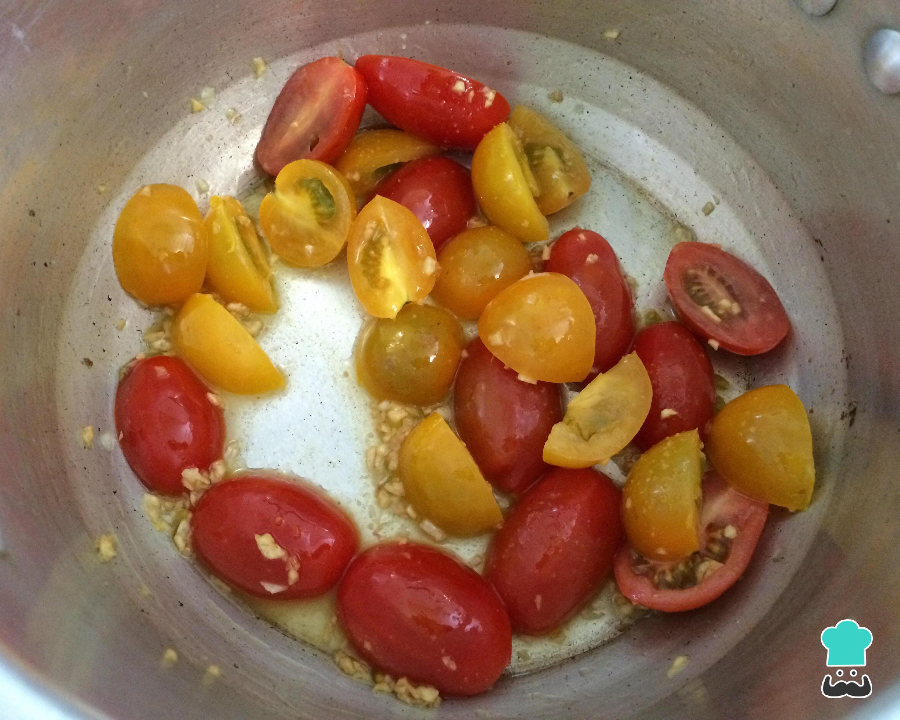 De seguida adicione os tomates cereja cortados pela metade, misture com os alhos e tempere com sal e pimenta. Deixe por mais alguns minutos, até os tomates murcharem levemente.