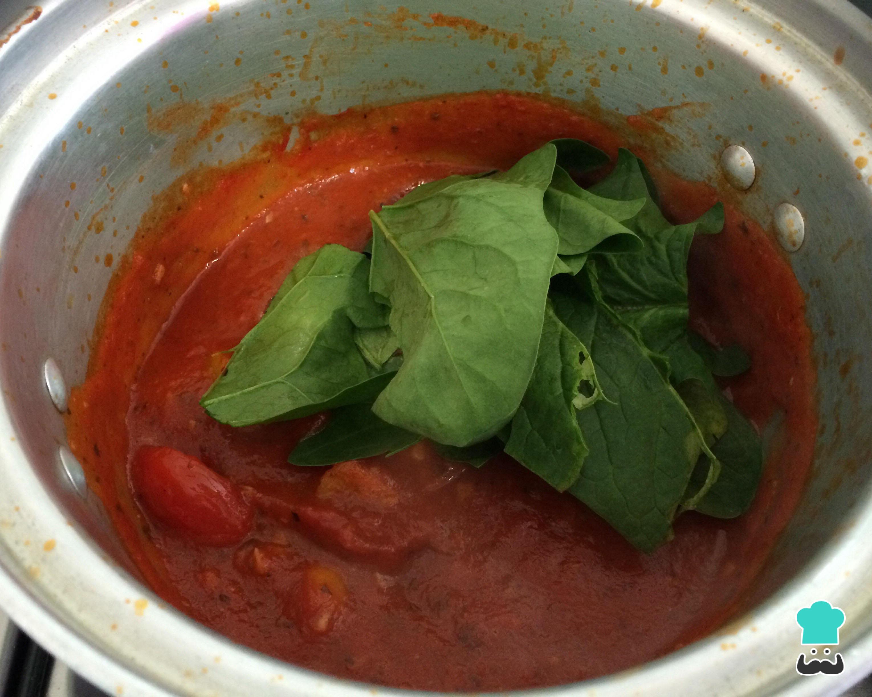 Para terminar de preparar este acompanhamento para salmão adicione o extrato de tomate na panela e misture. Coloque também as folhas de espinafre, misture e deixe no fogo por mais 1-2 minutos, mexendo de vez em quando, ou até o espinafre murchar. Acerte o sabor com sal e pimenta a gosto e desligue o fogo.