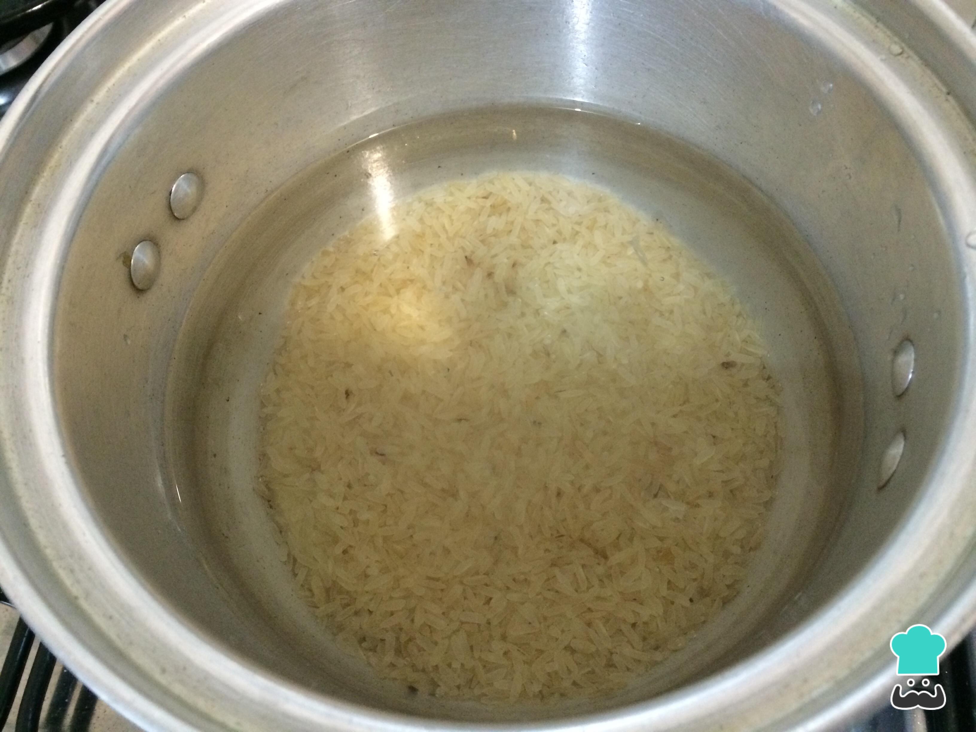 Em seguida coloque o arroz e a água numa panela, leve ao fogo médio e deixe cozinhar por 30-40 minutos.