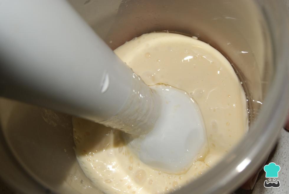 Sem deixar de bater, adicione o óleo ou azeite em um fio bem fino. Pouco a pouco poderá observar que a mistura se transforma numa pasta espessa, semelhante a uma maionese.