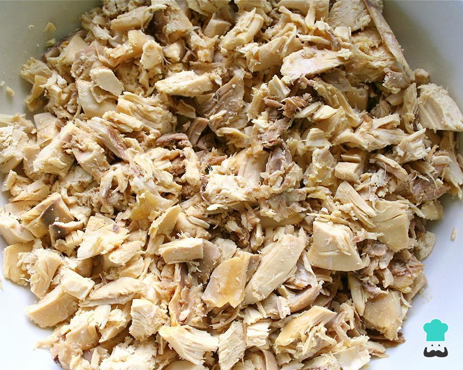 Para esta receita de ají de galinha peruano, a primeira coisa que precisa de fazer é colocar o frango cozendo em água abundante e um pouco de sal. Quando estiver pronto, retire e desfie, e reserve o caldo.