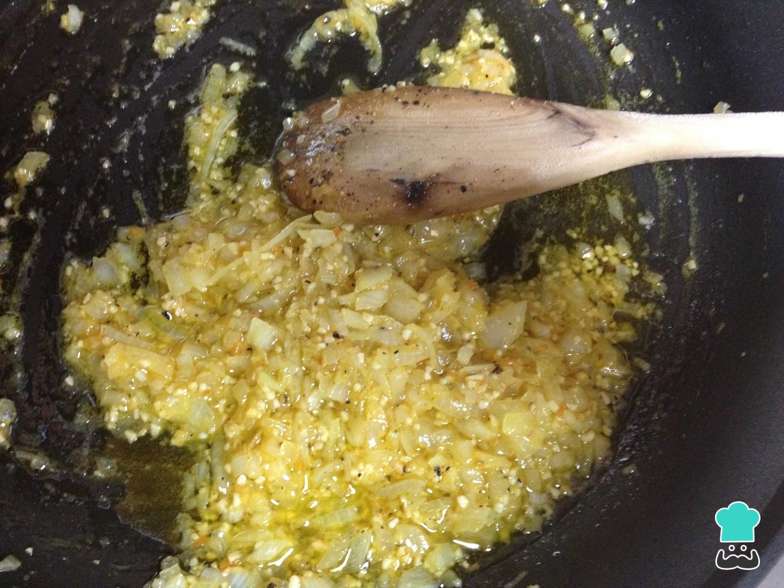 Coloque o caldo do frango em uma tigela, adicione o pão sem crostae deixe hidratar. Enquanto isso, leve ao fogo médio uma panela, refogue a cebola no azeite e, quando estiver transparente, acrescente junte o alho, o ají moído, o sal e a pimenta. Deixe dourar, acrescente o pão e misture.