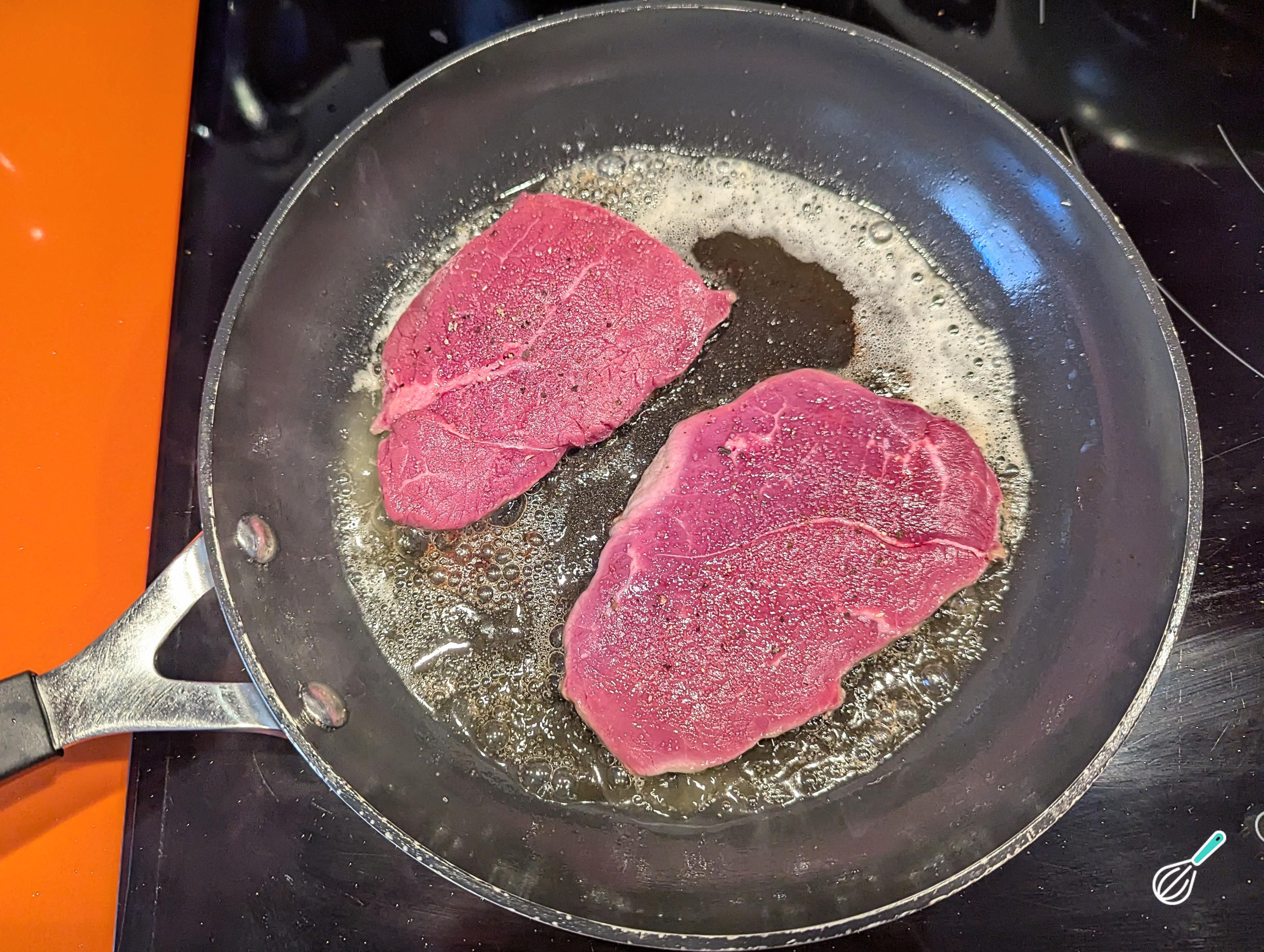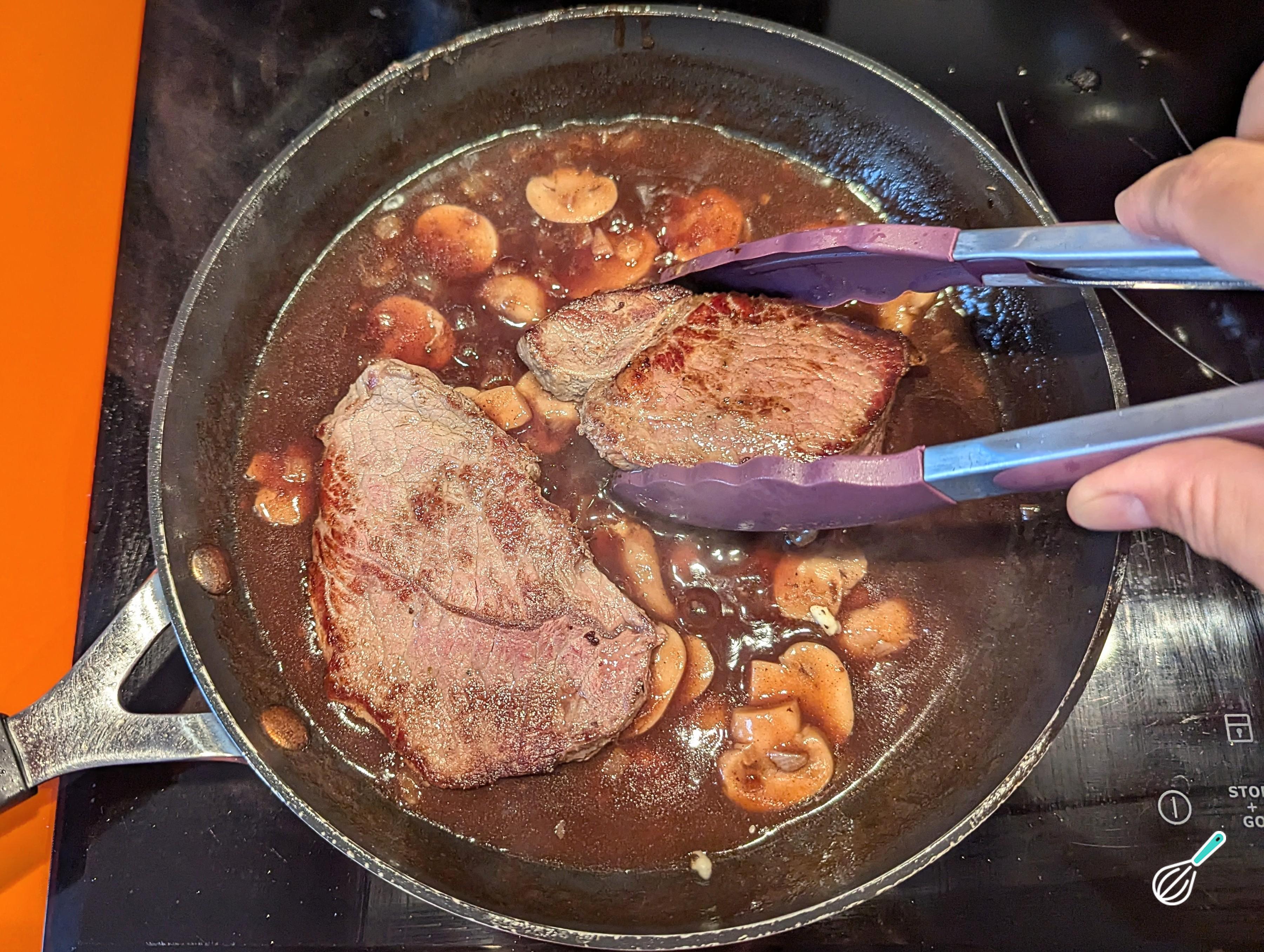 Ajuste o sal e pimenta. Retorne os filés de alcatra para a frigideira apenas para aquecer e envolvê-los no molho.