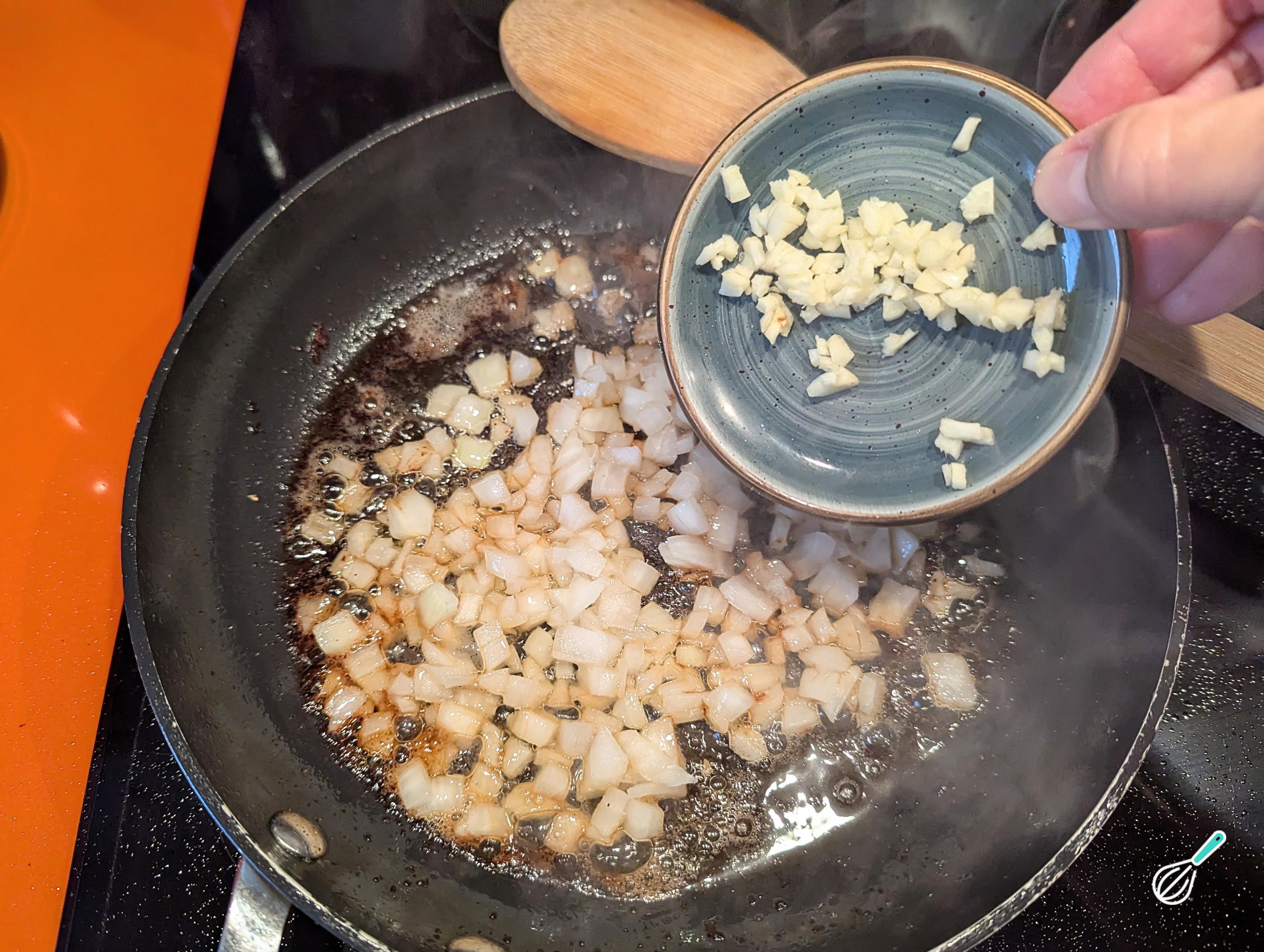 Na mesma frigideira, adicione uma colher de manteiga e refogue a cebola até murchar, logo, adicione o alho picado e deixe dourar levemente.