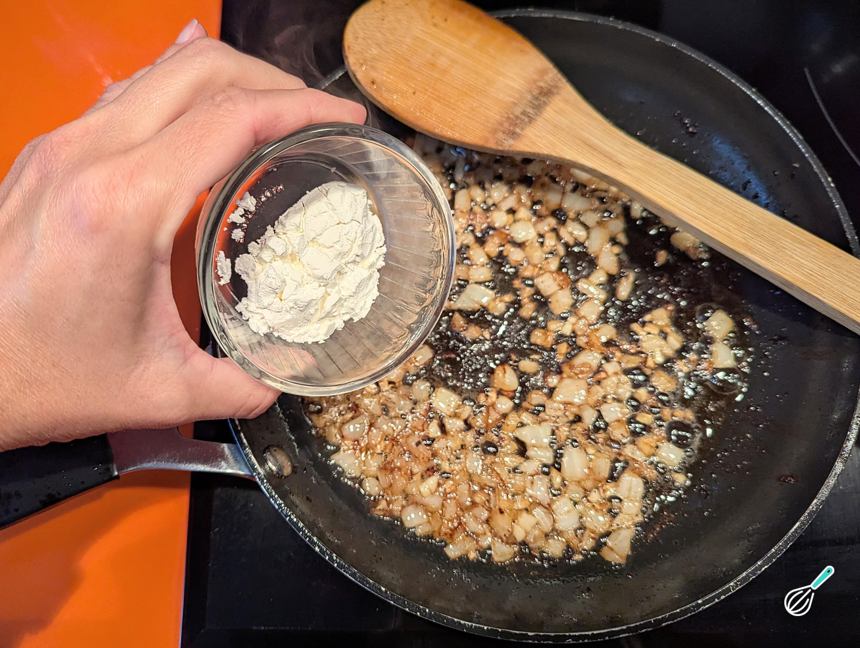 Acrescente o amido de milho (ou se preferir, a farinha de trigo) e mexa bem, formando um roux. Cozinhe por um minuto para eliminar o gosto cru da farinha.