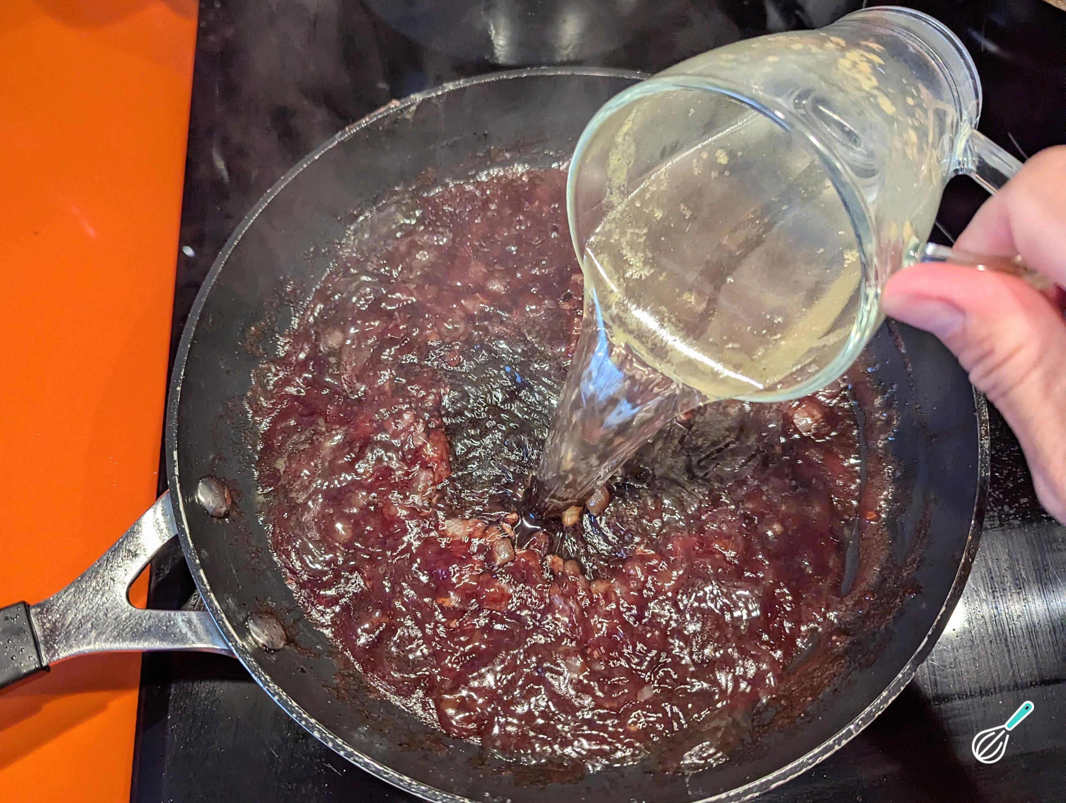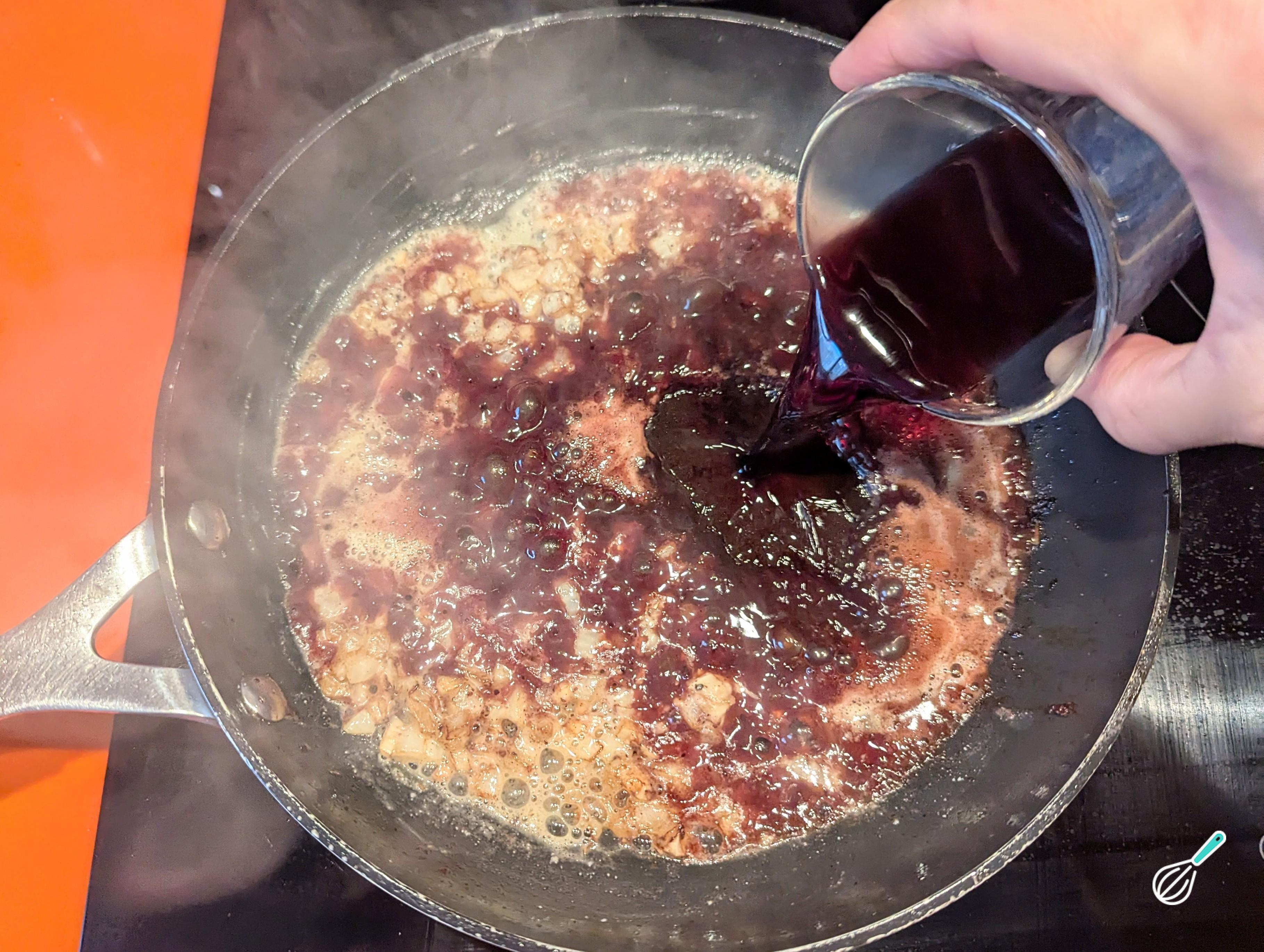 Adicione o vinho madeira e mexa até que o fundo da frigideira solte todo o sabor. Deixe reduzir por 2 minutos.