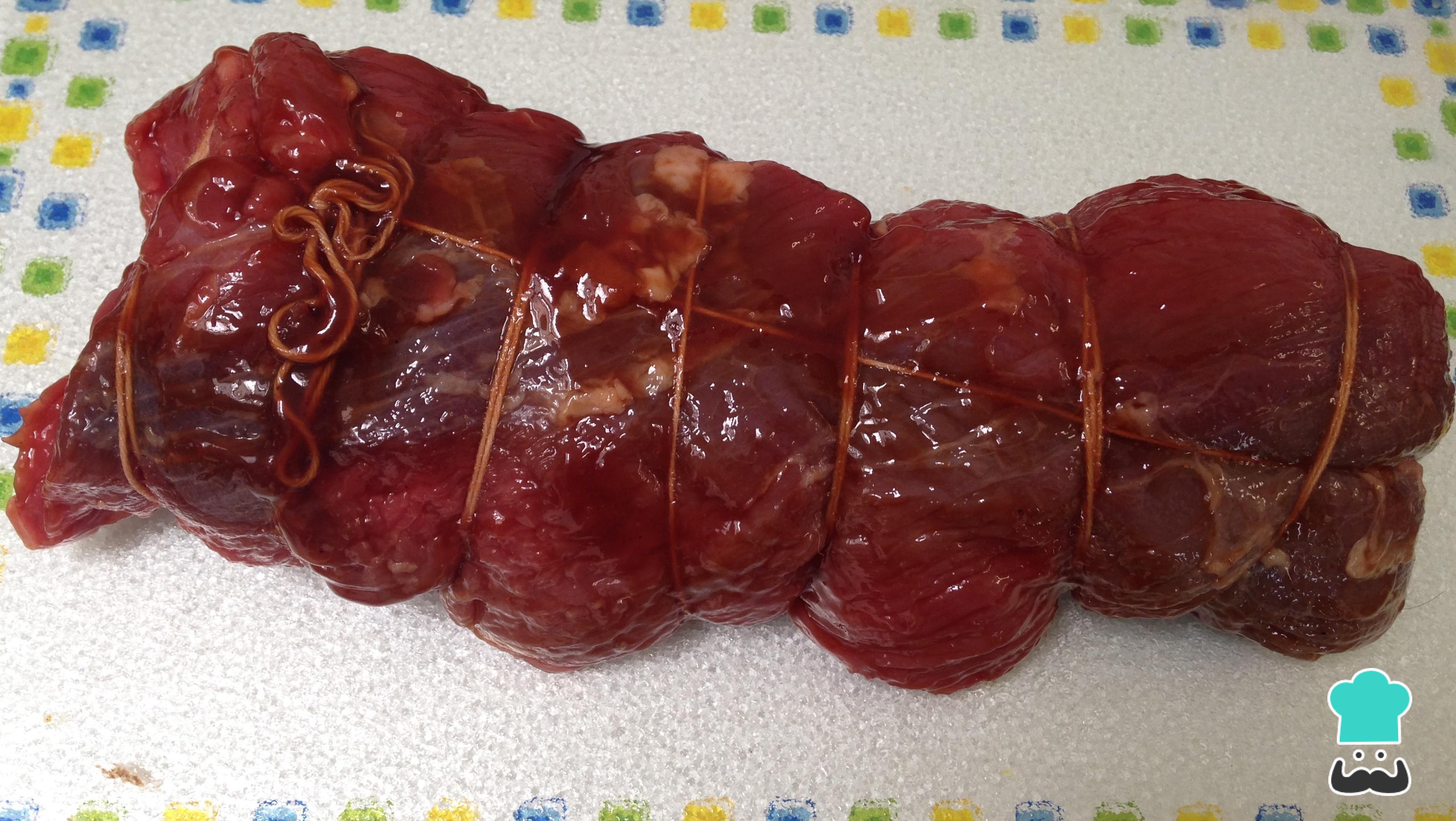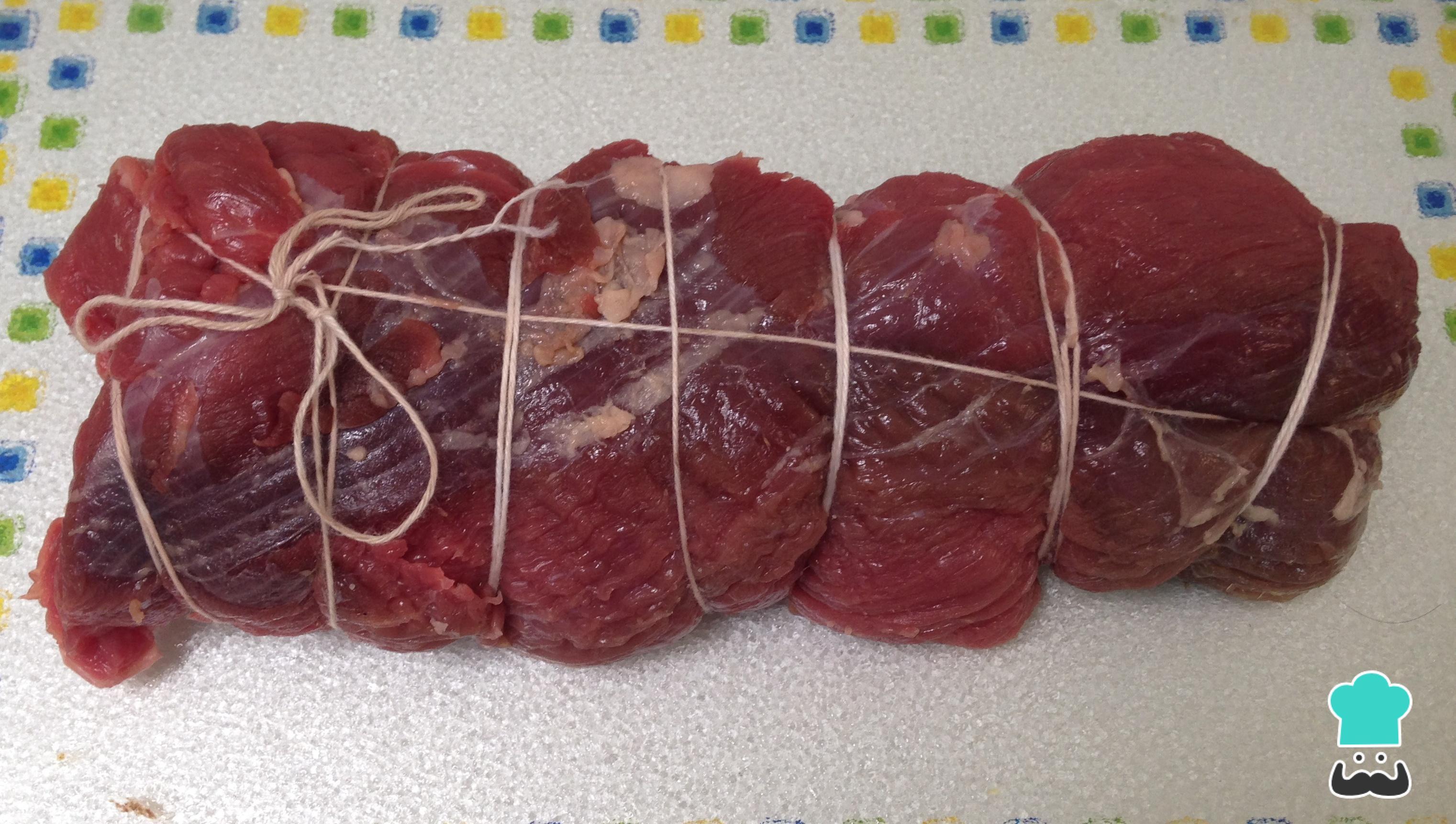 O primeiro passo desta receita de alcatra em molho de ostra é amarrar bem a alcatra com barbante de cozinha.