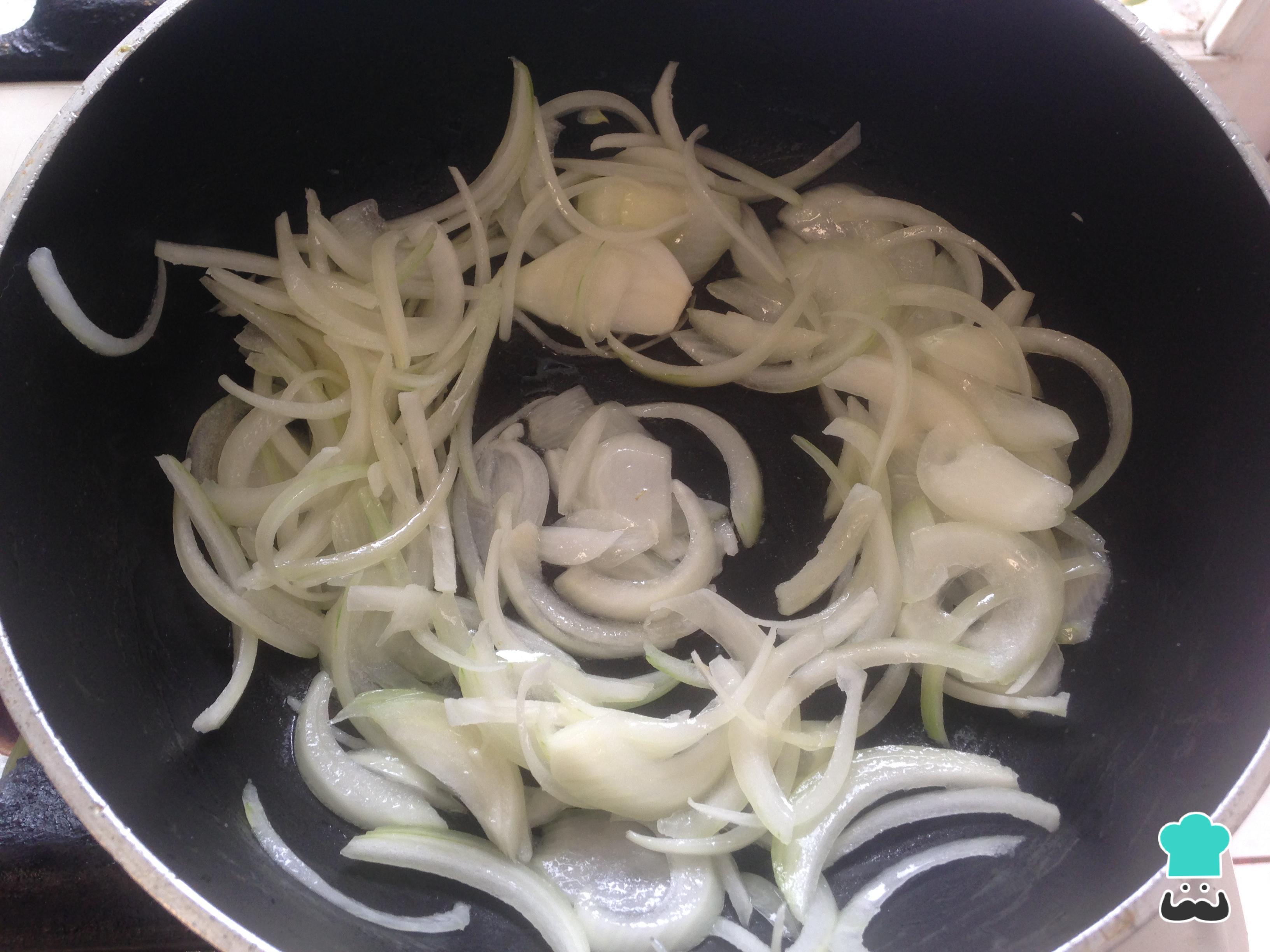 Corte a cebola em meias-luas e refogue em uma frigideira com um pouco de azeite ou óleo.