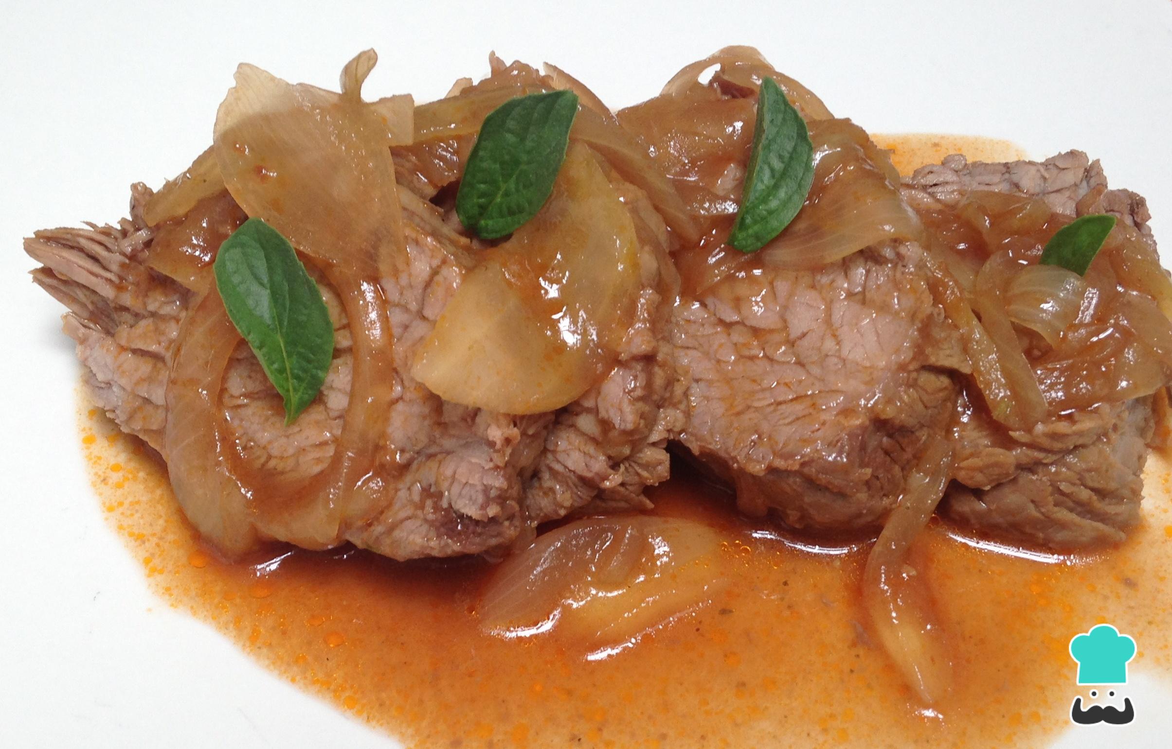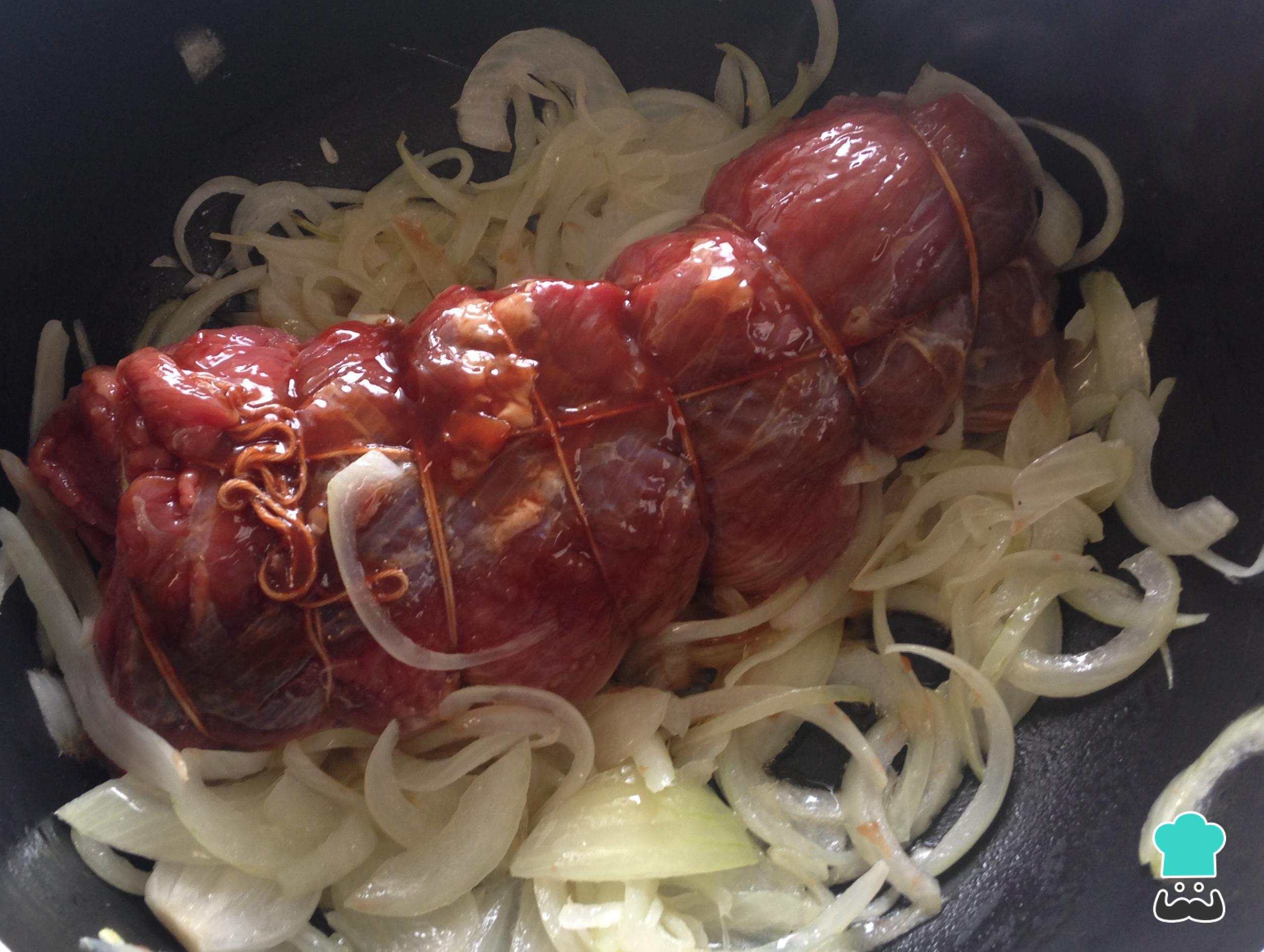 Coloque a alcatra sobre as cebolas e cozinhe até dourar de todos os lados.