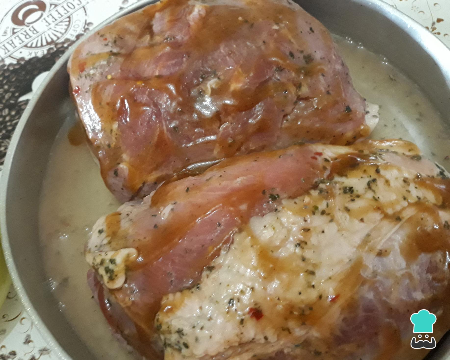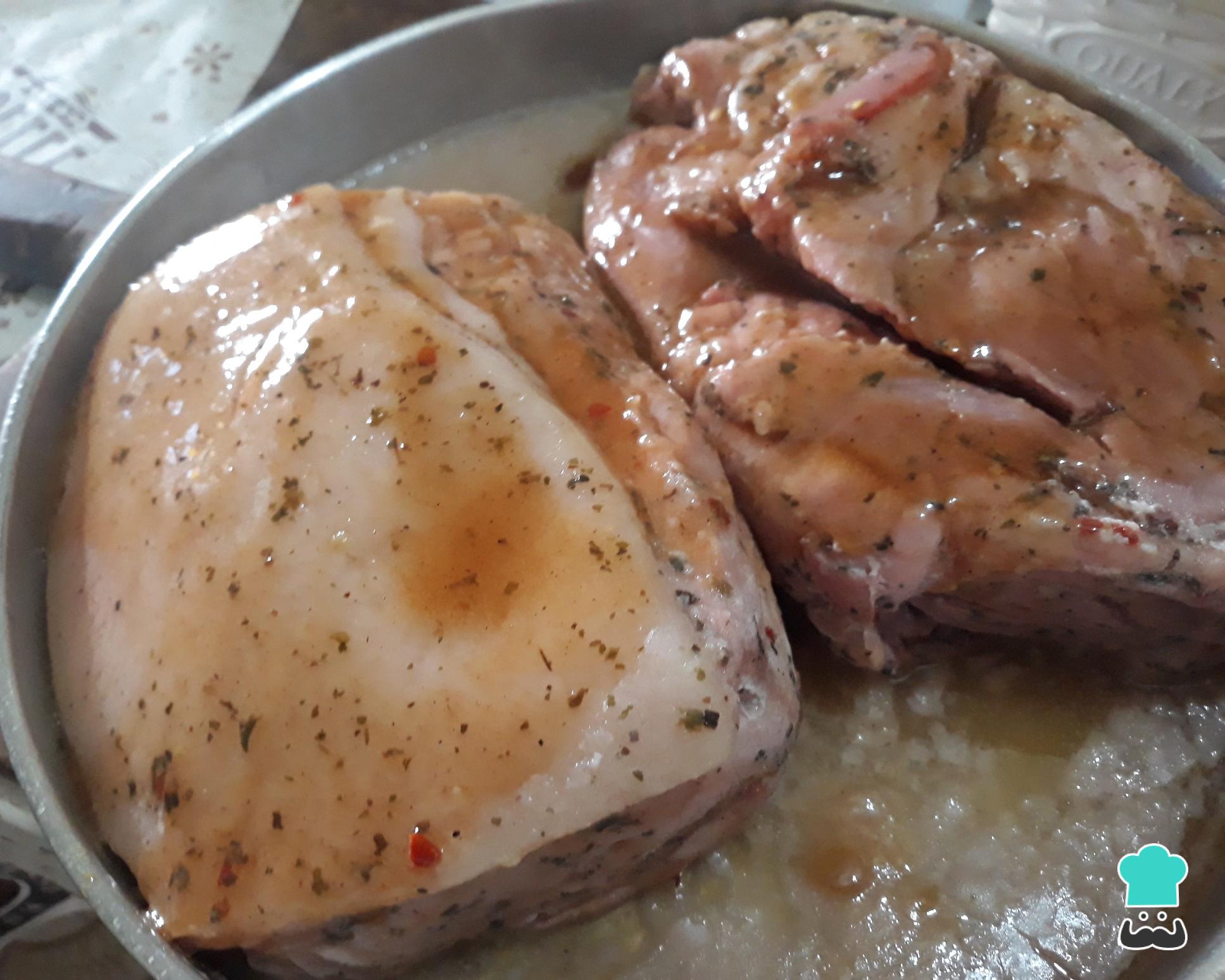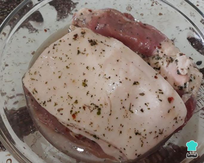 Coloque a carne em uma assadeira e passe uma parte do molho nela. Cubra com papel alumínio e leve ao forno preaquecido nos 200°C por 1 hora.