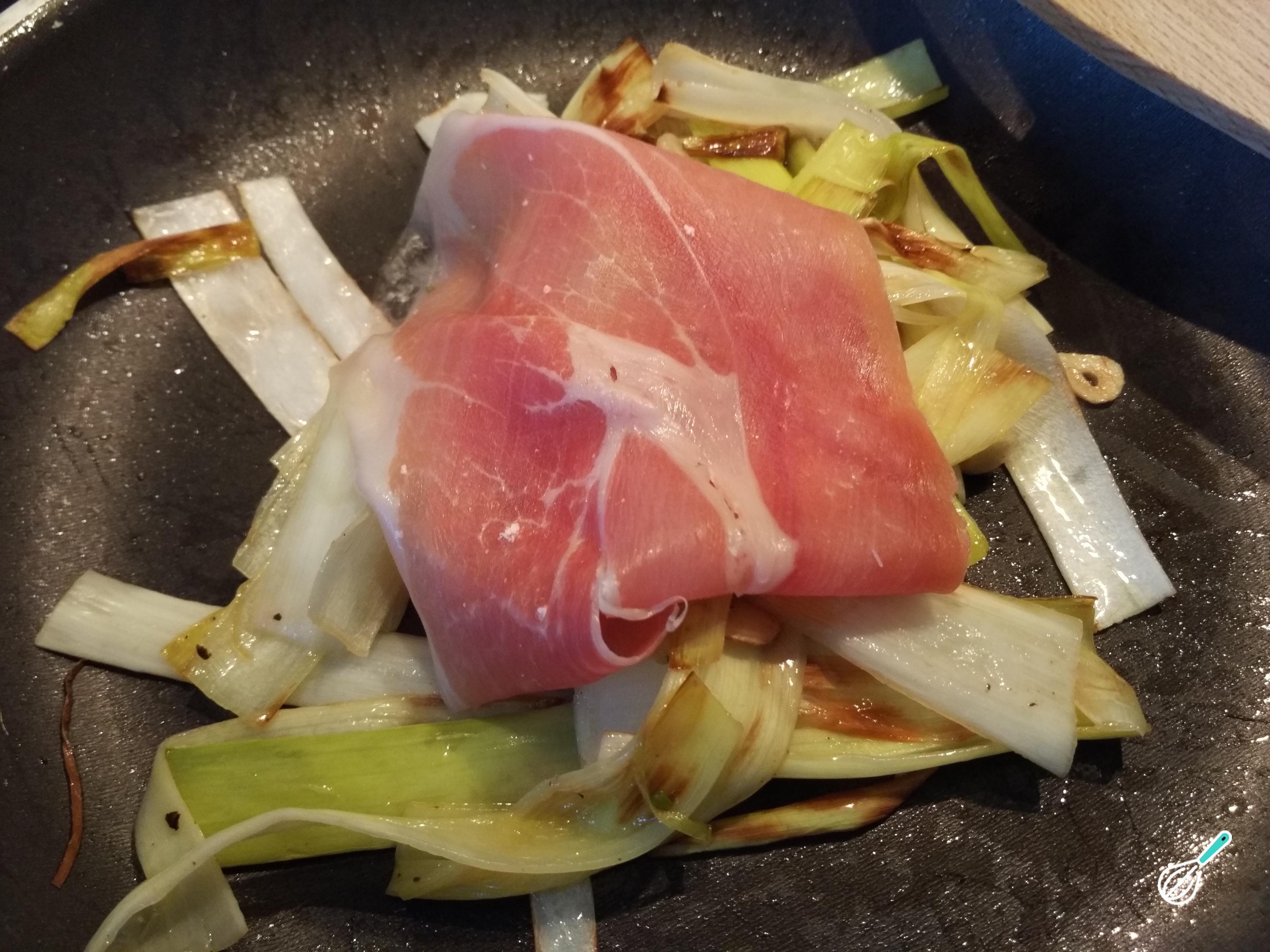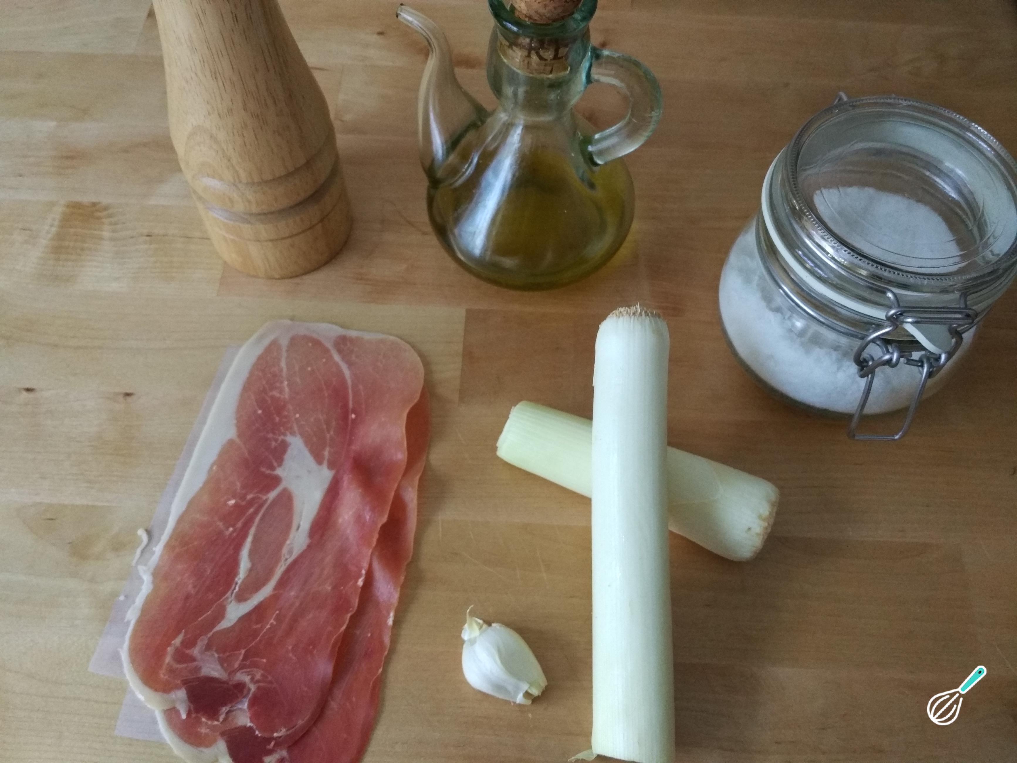 Reúna todos os ingredientes para preparar o alho-poró com presunto. Este prato vai bem com um ovo pochê ou ovo frito.