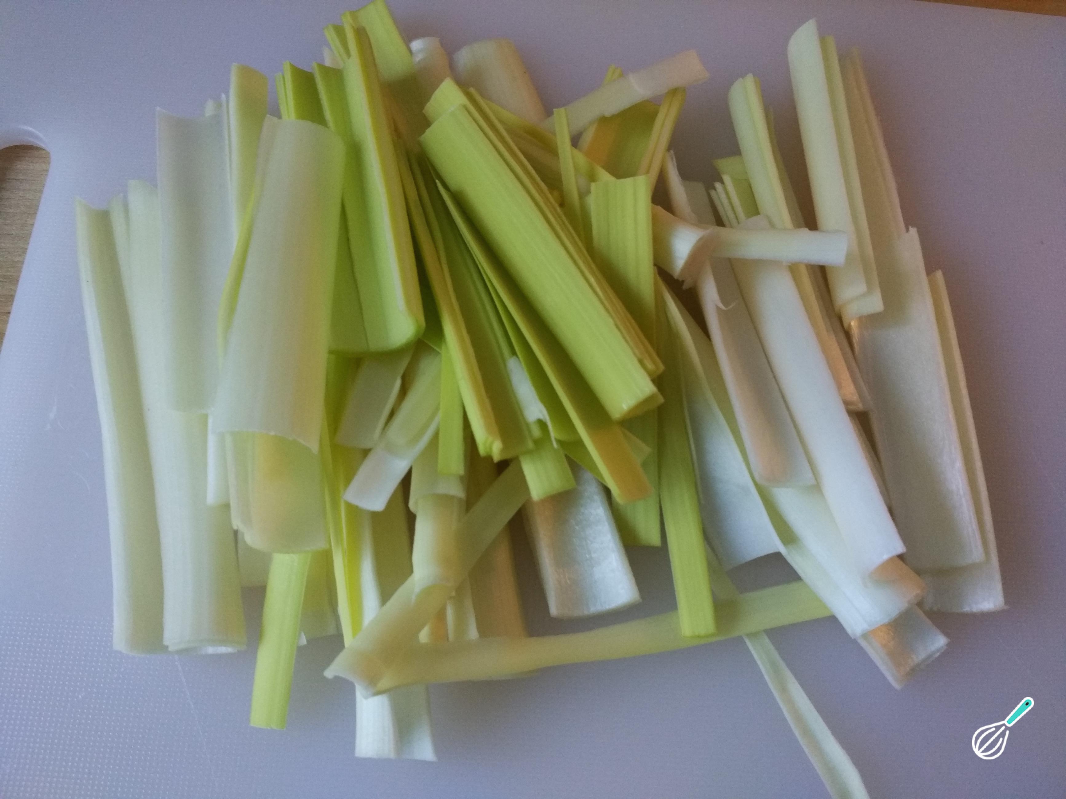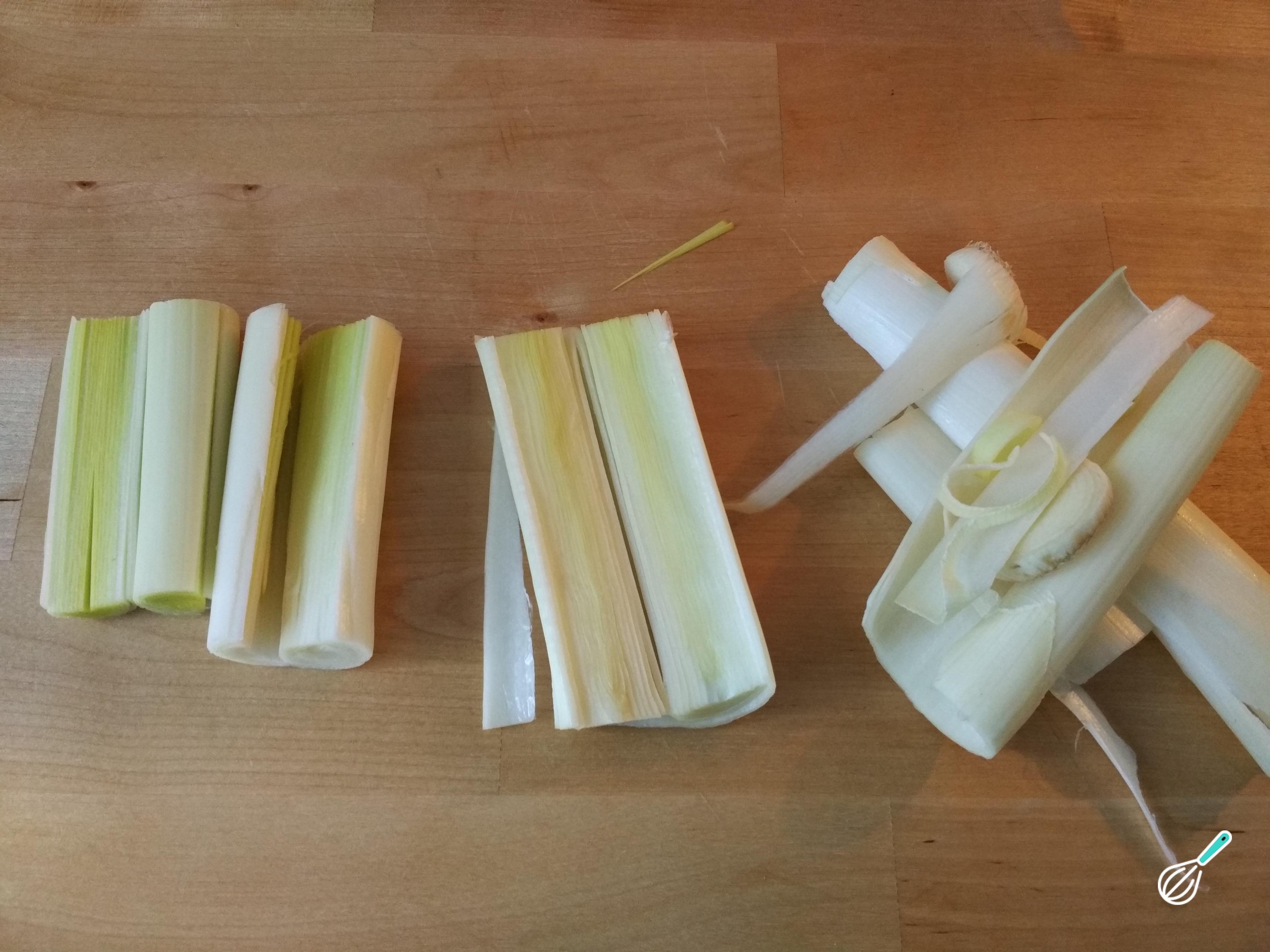 Descasque o alho-poró como indicado na foto: corte as pontas, retire as folhas exteriores e corte-o ao meio. No fim lave tudo com água fria e seque.