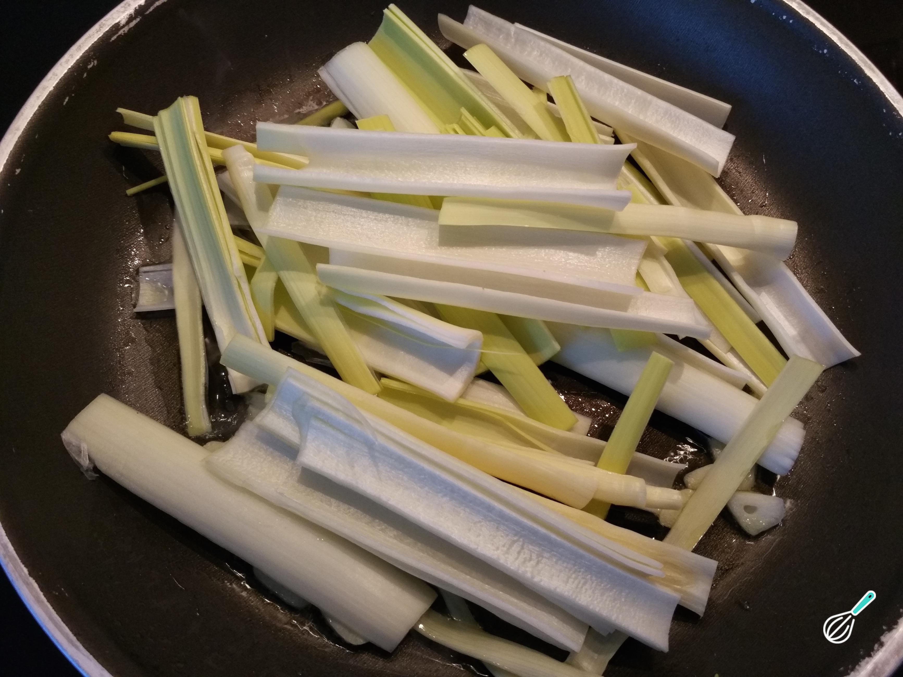 Em uma frigideira com uma colher de sopa de azeite, doure o alho e, quando este ganhar cor, adicione o alho-poró. Coloque um pouco de sal e pimenta do reino moída e deixe cozinhar até amolecer e até começarem a dourar.