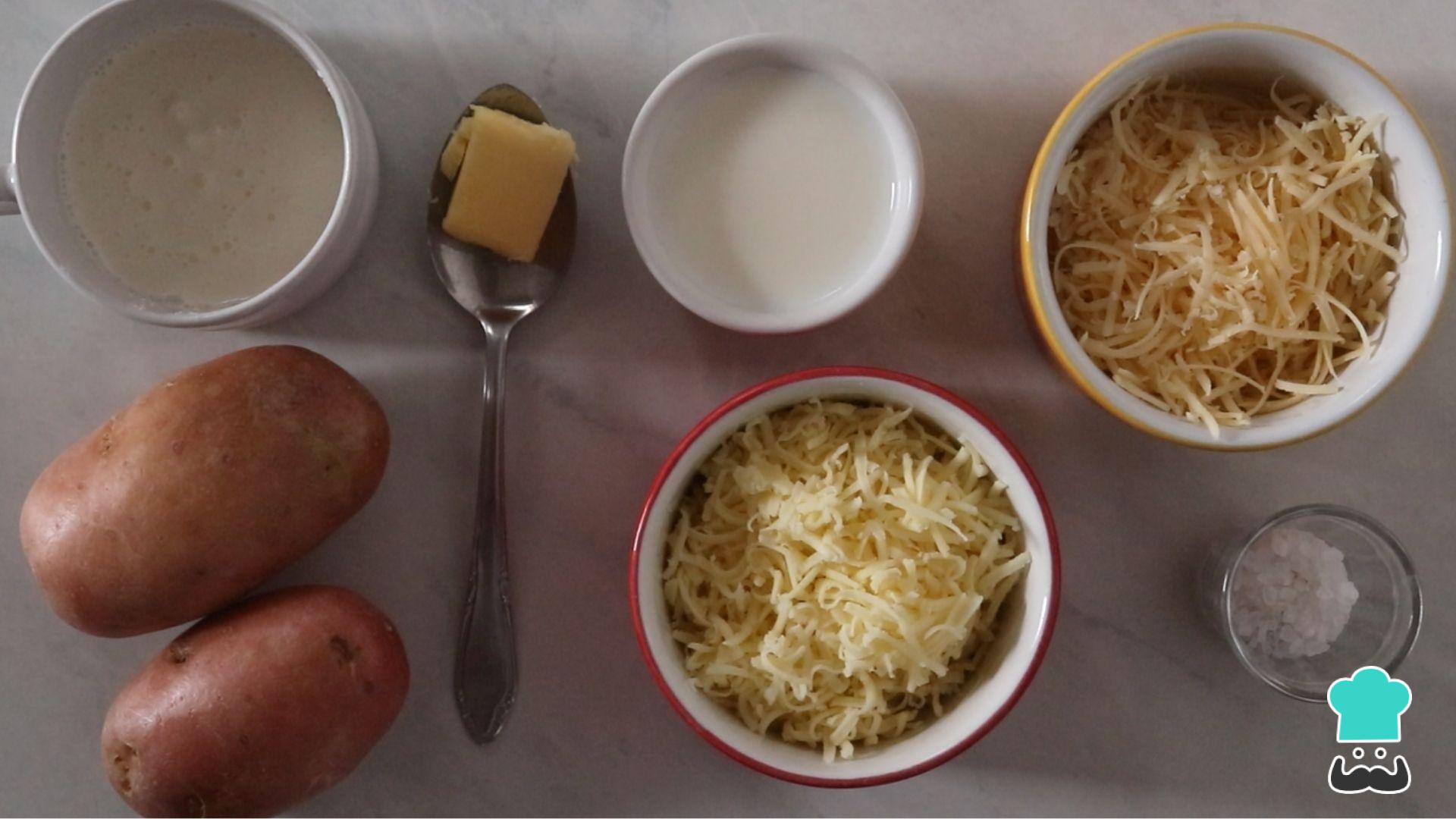Comece separando os ingredientes. Rale os dois queijos e lave bem as batatas, pois vamos cozinhá-las com casca.