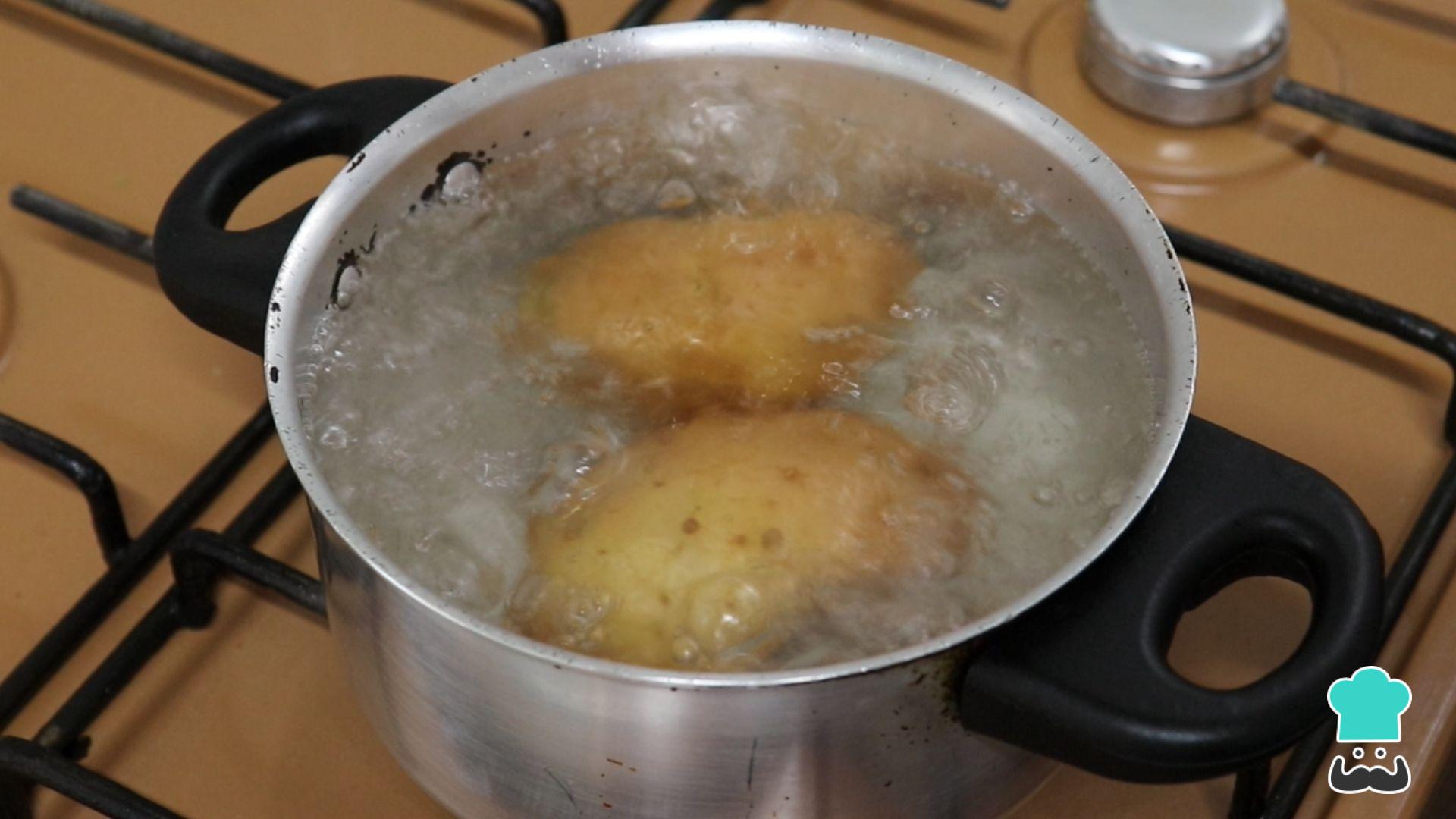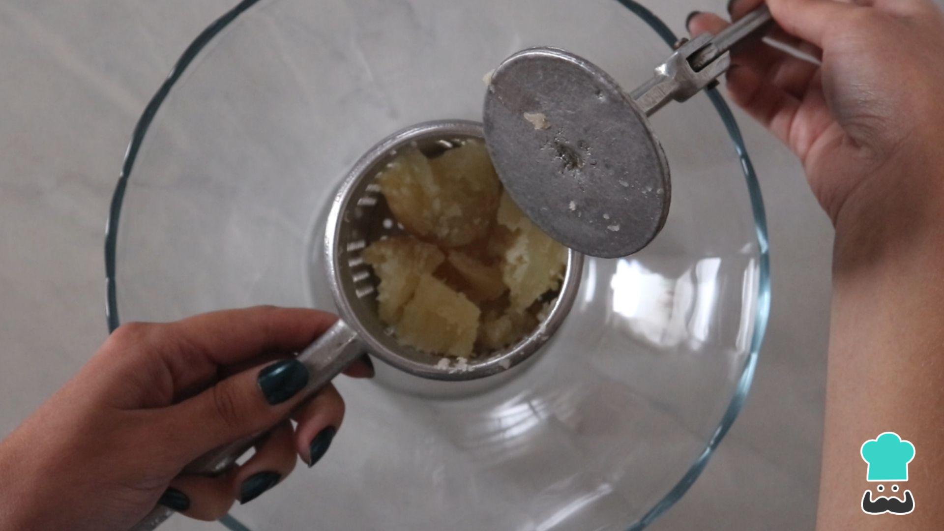 Quando estiverem cozidas, tire da água e descasque ainda quente (cuidado para não se queimar: descasque com ajuda de um pano de prato seco). A casca sairá com facilidade. Em seguida amasse bem as batatas usando um espremedor.