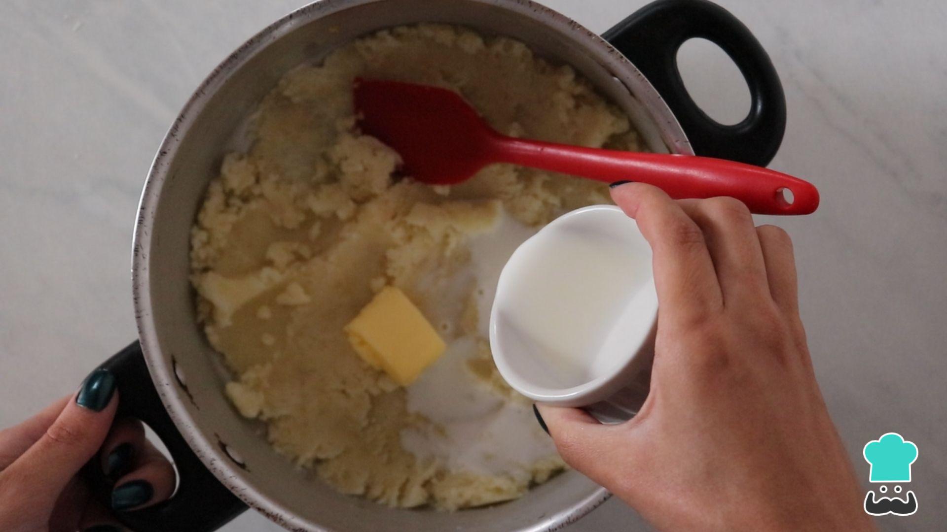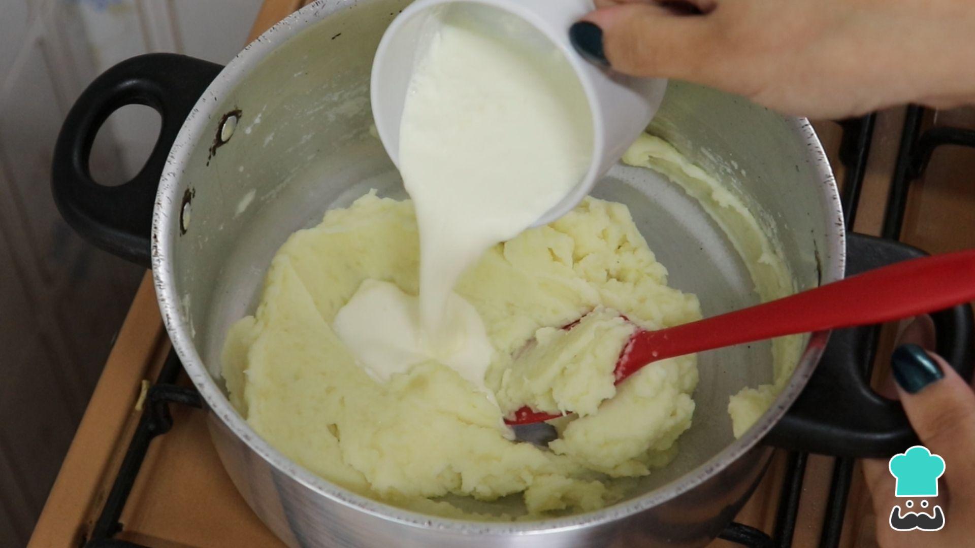 Coloque as batatas amassadas em uma panela, junte o leite e a manteiga e leve de volta ao fogo dessa vez em temperatura baixa mexendo sempre.