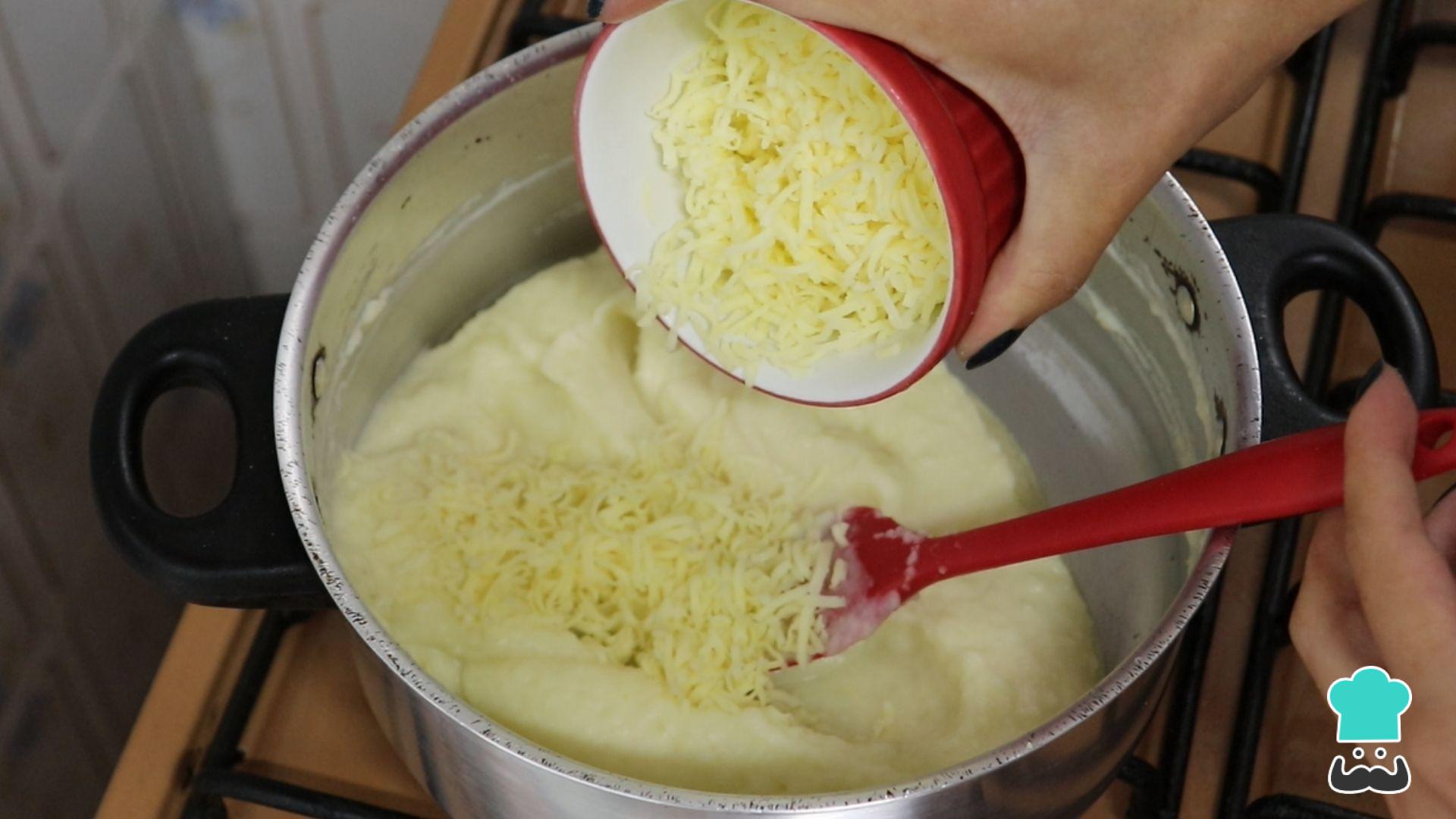 Por fim, junte os queijos aos poucos, intercalando entre o gruyere e a mussarela, mexendo bem até incorporar todo o queijo.