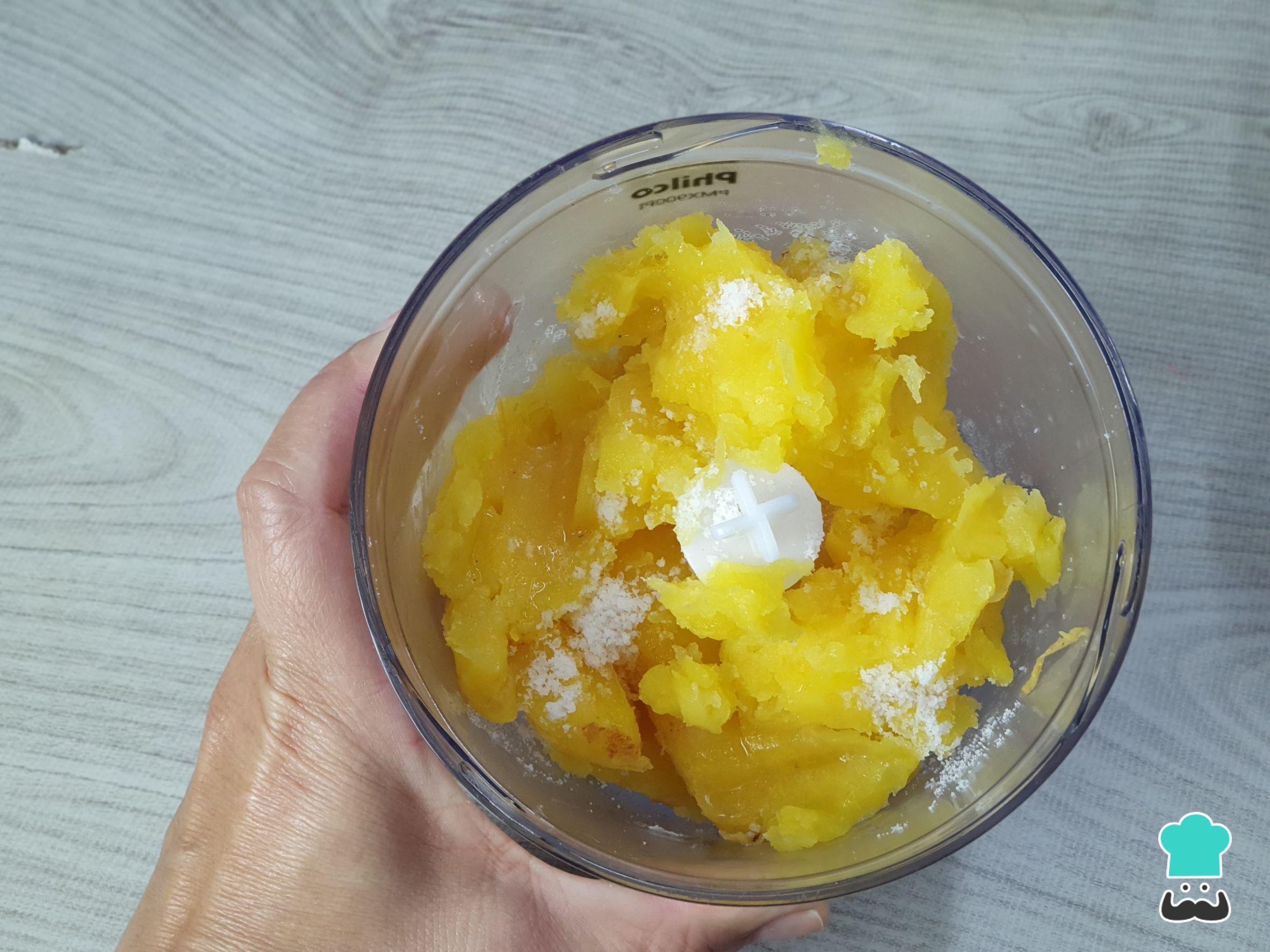 Comece esta receita cozinhando a mandioquinha em água, previamente descascada, até que amacie muito bem. Ainda quente, bata a mandioquinha em um processador com uma pitada de sal.