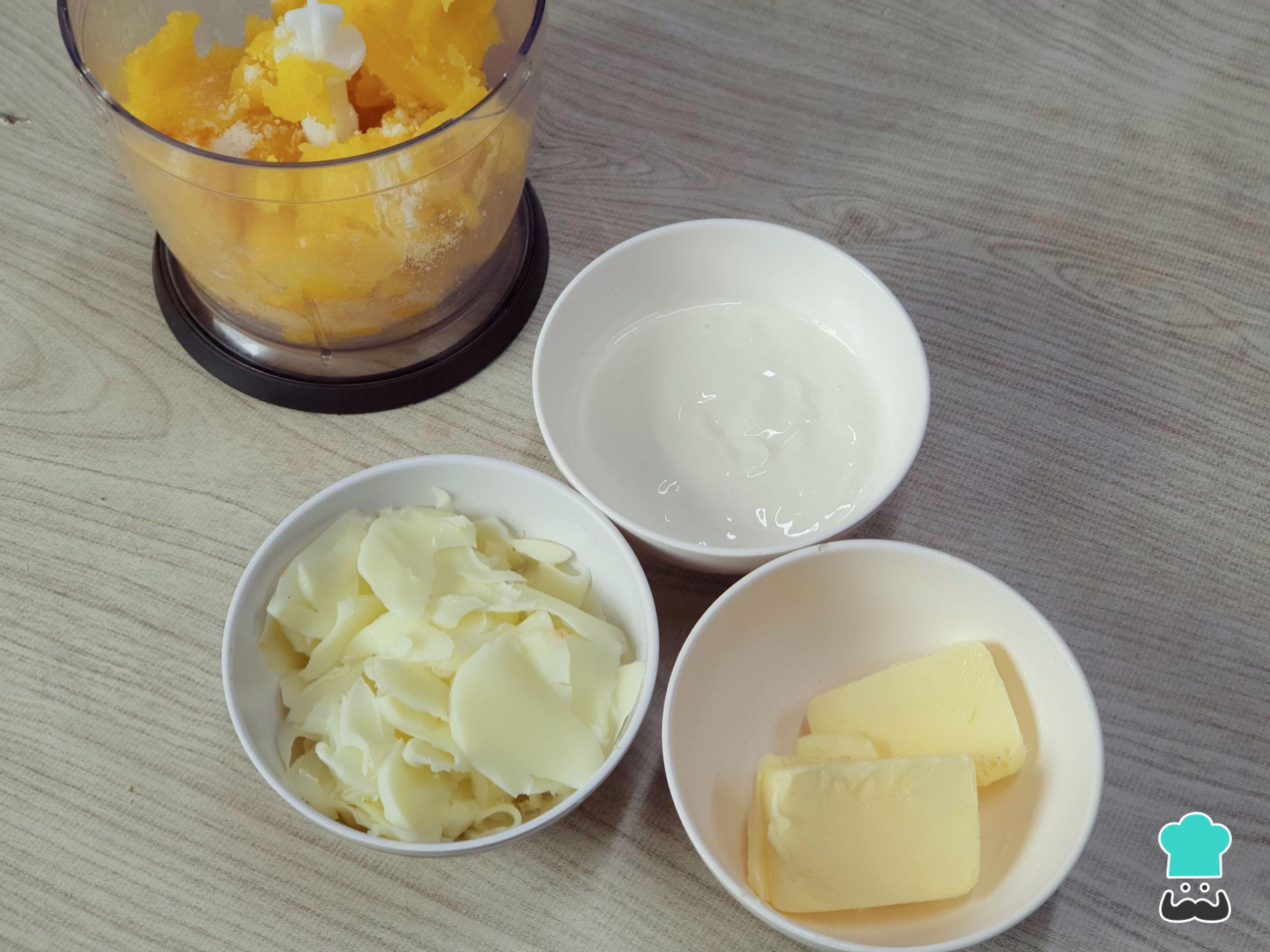 Depois do passo anterior, separe os demais ingredientes desta receita de aligot de mandioquinha (aligot de batata baroa). O ideal é que o queijo esteja fatiado.
