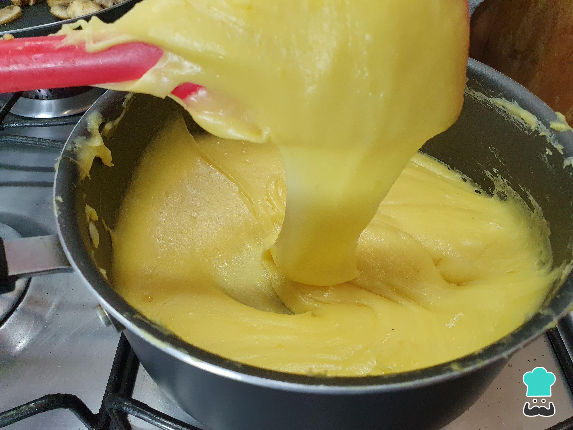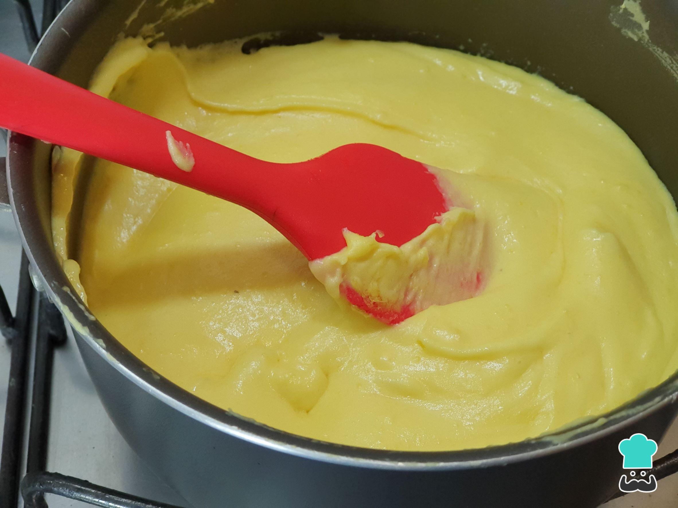 Transfira esse creme em uma panela e leve para aquecer em fogo baixo, mexendo sempre para que não se apegue ao fundo da panela.