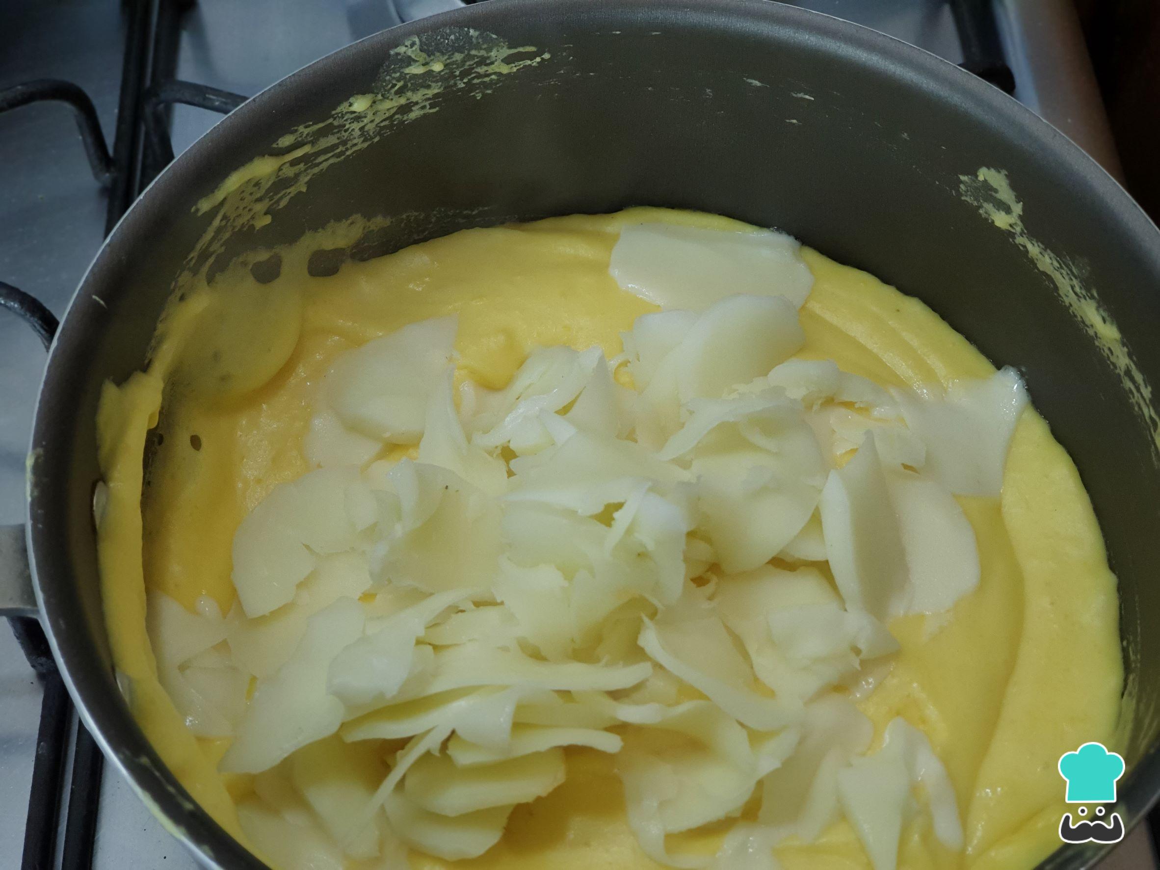 Quando o purê estiver bem quente, adicione o queijo e mexa muito bem, até que esteja tudo bem incorporado.