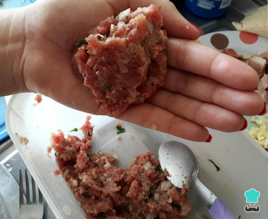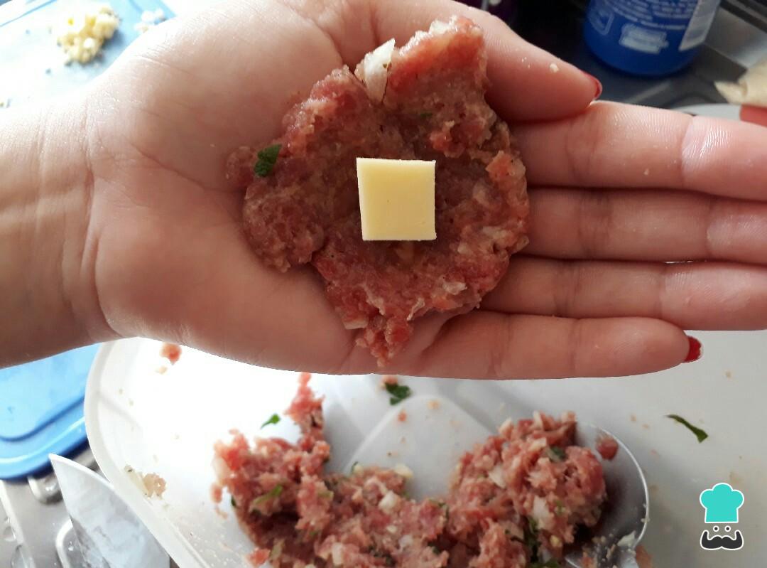 Com o auxílio de uma colher, coloque um pouco da massa de carne moída na palma da mão e espalhe. Depois, coloque ao centro um cubo de mussarela.