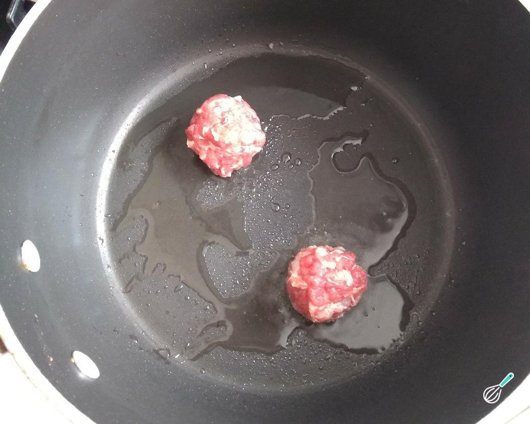 Aqueça uma panela antiaderente com um fio de óleo ou azeite. Faça pequenas bolinhas com a carne temperada e vá colocando todas na panela. Tampe a panela e deixe em fogo baixo. Após 7 minutos aproximadamente, vire as almôndegas na panela para que dourem do outro lado. Tampe a panela novamente e aguarde por mais alguns minutos, até que todas as almôndegas estejam douradas uniformemente.