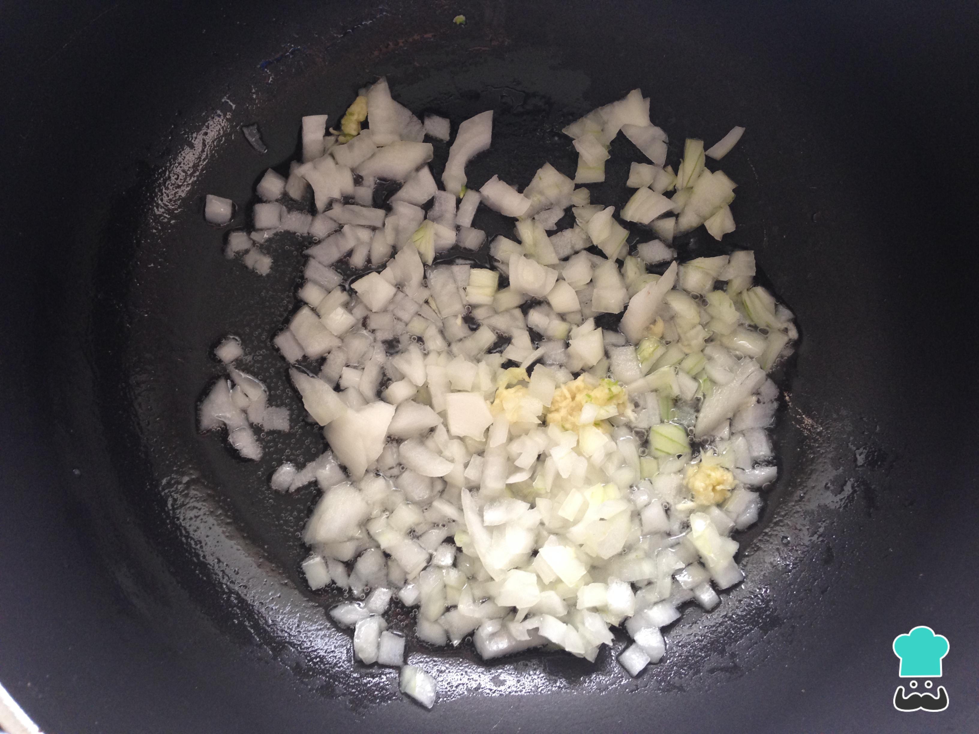 Coloque o azeite ou óleo em uma panela, junto com a cebola e o alho picados finamente e leve ao fogo médio. Quando estes ingredientes estiverem dourados, desligue o fogo e reserve.