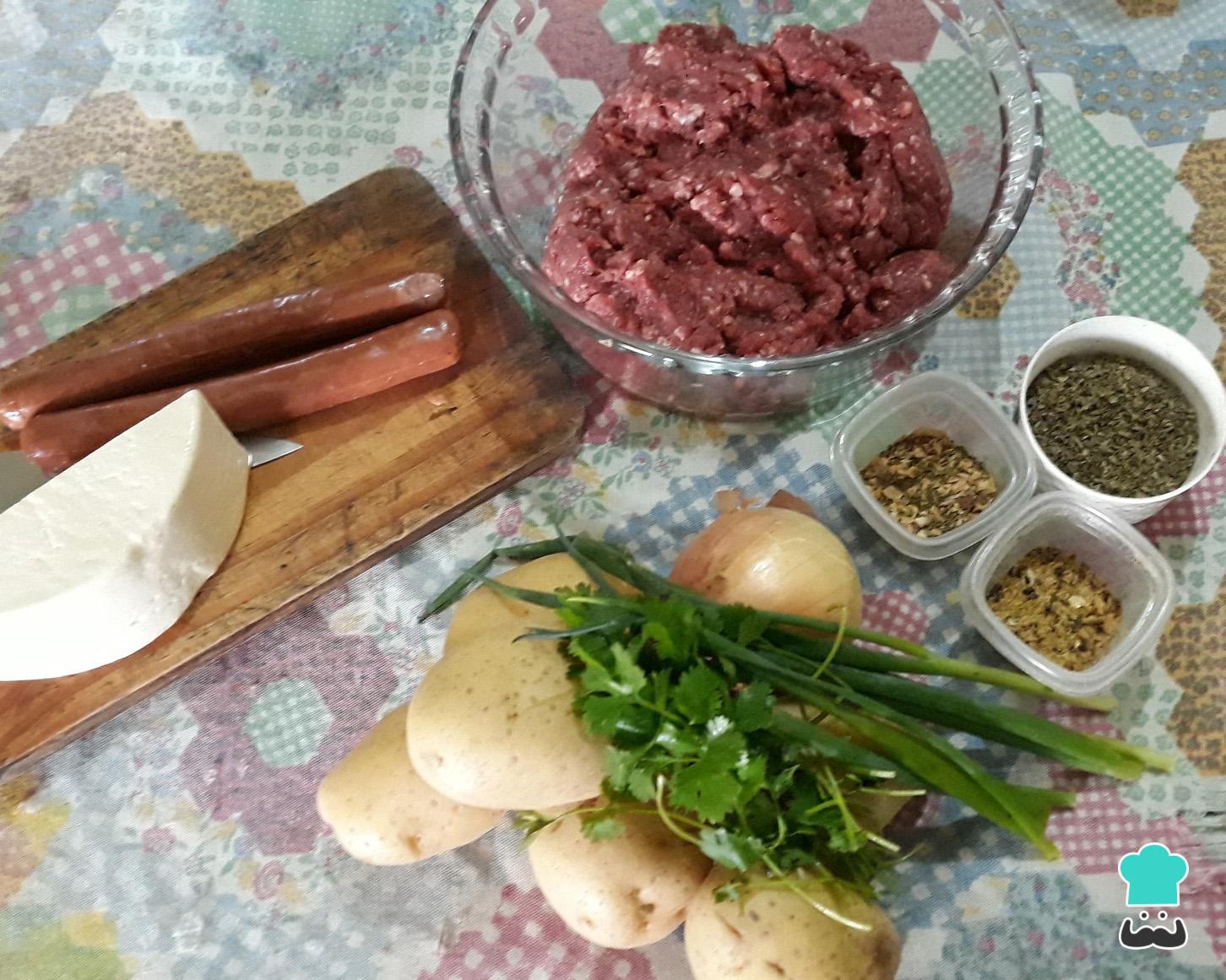 Separe os ingredientes para facilitar o preparo desta receita de almôndegas no forno com batata. Os temperos são a gosto - eu usei cheiro verde fresco, chimichurri desidratado, lemon pepper, pimenta do reino, curry, orégano e sal.