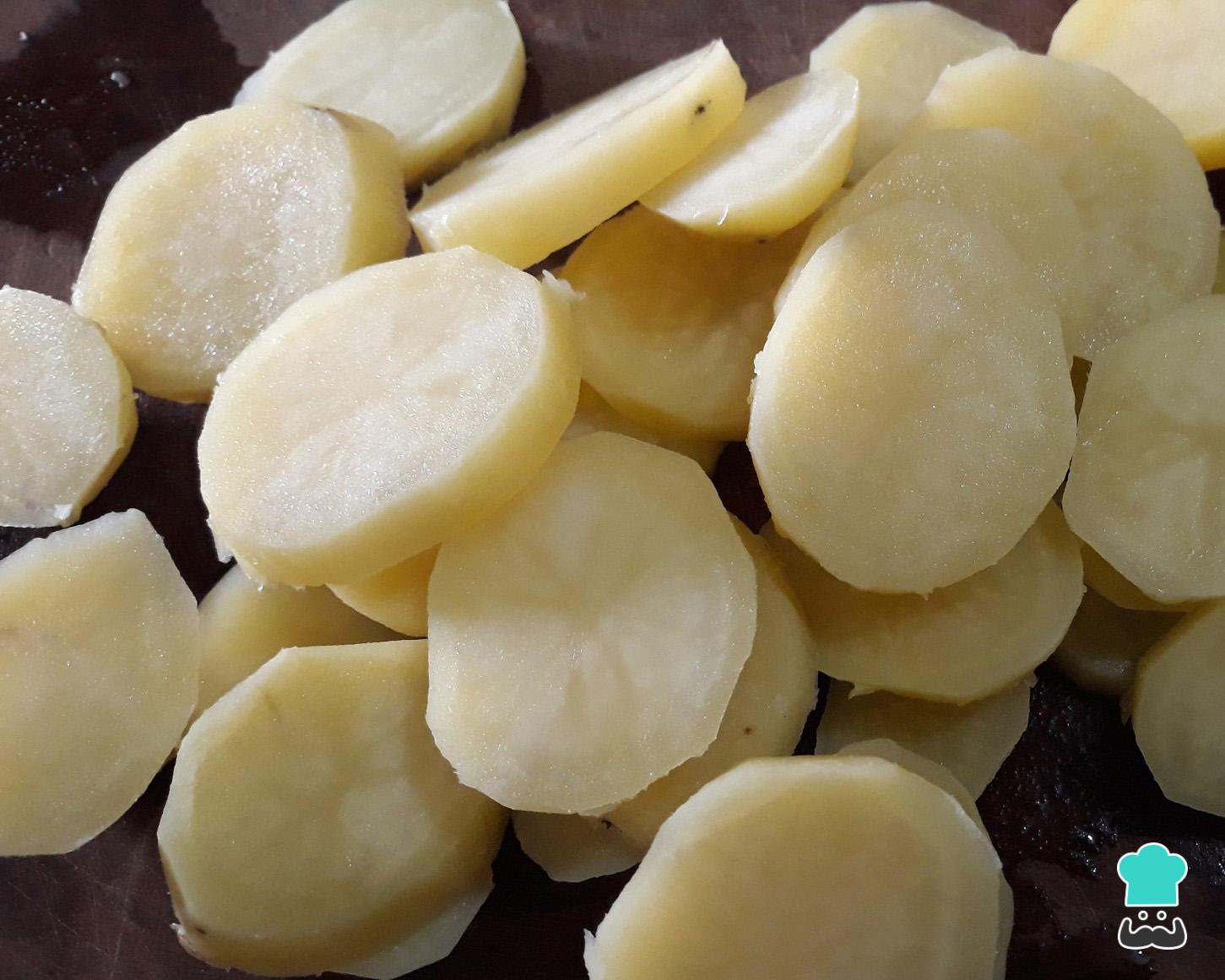 Descasque e corte as batatas em rodelas. Coloque as batatas para cozinhar por 15 minutos em água com um pouco de sal e escorra.