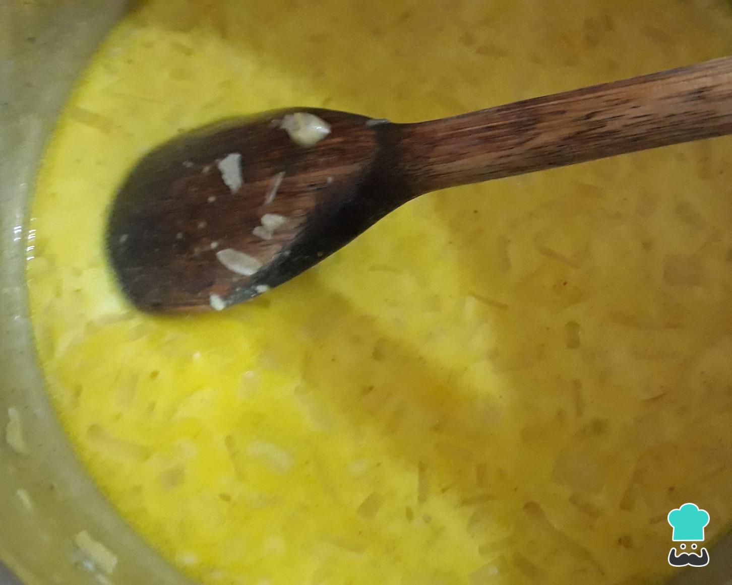 Enquanto espera as batatas ficarem prontas, prepare o molho branco: leve ao fogo em uma panela o azeite, o alho e o restante da cebola picada e deixe refogar um pouco. Acrescente o curry, em seguida coloque o leite com o amido dissolvido nele, mexa até engrossar e tempere com o sal e a pimenta do reino. Por último, já com a panela desligada, coloque o coentro.