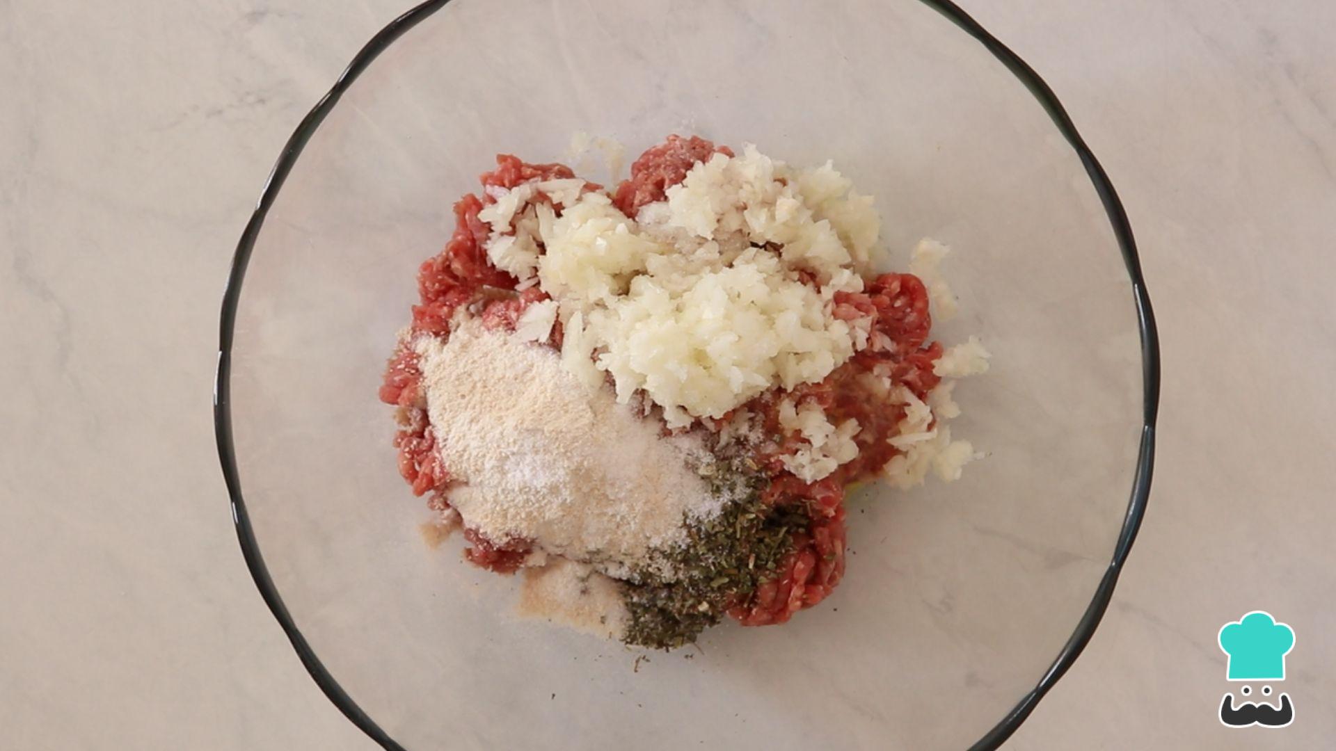 Agora vamos preparar as almôndegas: em uma tigela grande coloque todos os ingredientes exceto o azeite.