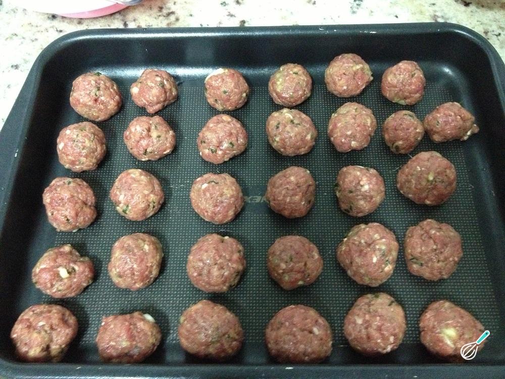 De seguida, modele a mistura em bolinhas. Coloque as almôndegas com pão amanhecido em uma assadeira previamente untada com um fio de azeite, cubra a assadeira com papel alumínio e asse por 30 minutos. Retire o papel alumínio e deixe cozinhar por 10 minutos mais.