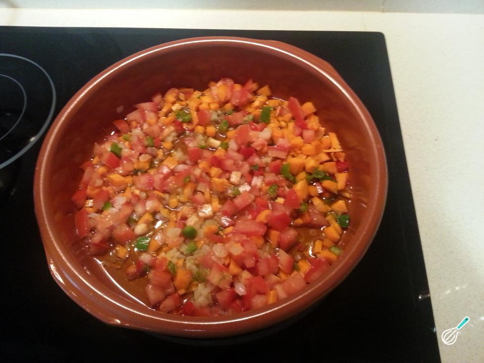 Pique finamente a cebola, os pimentões, o alho e o tomate.