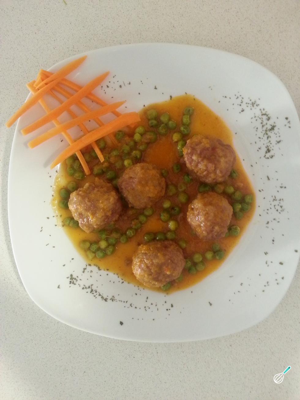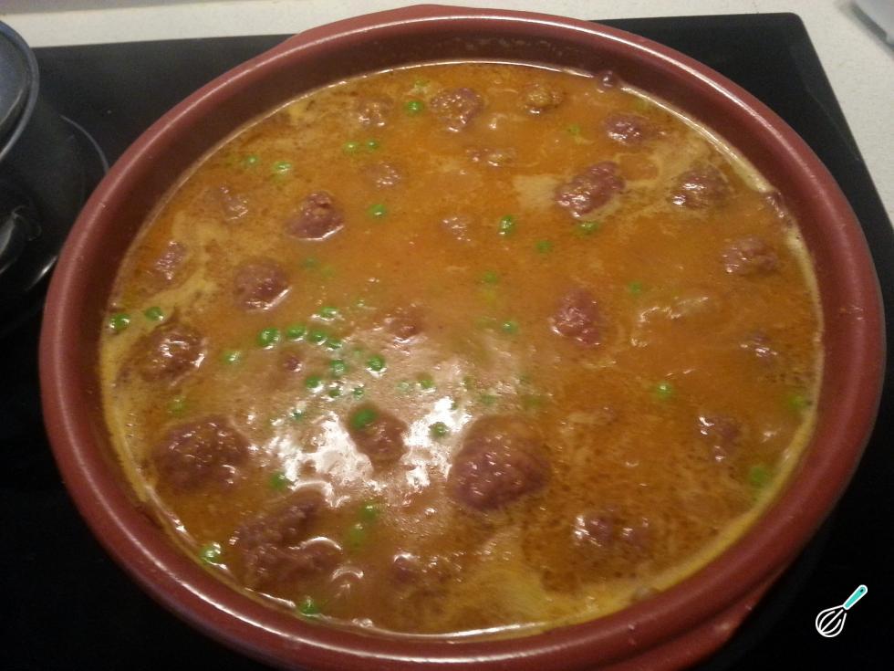 Refogue as almôndegas de carne levemente para a farinha dourar. Em seguida, coloque as almôndegas na panela e deixe cozinhar por 30 minutos. Passado este tempo, adicione as ervilhas, corrija o tempero e deixe cozinhar por mais 10 minutos.