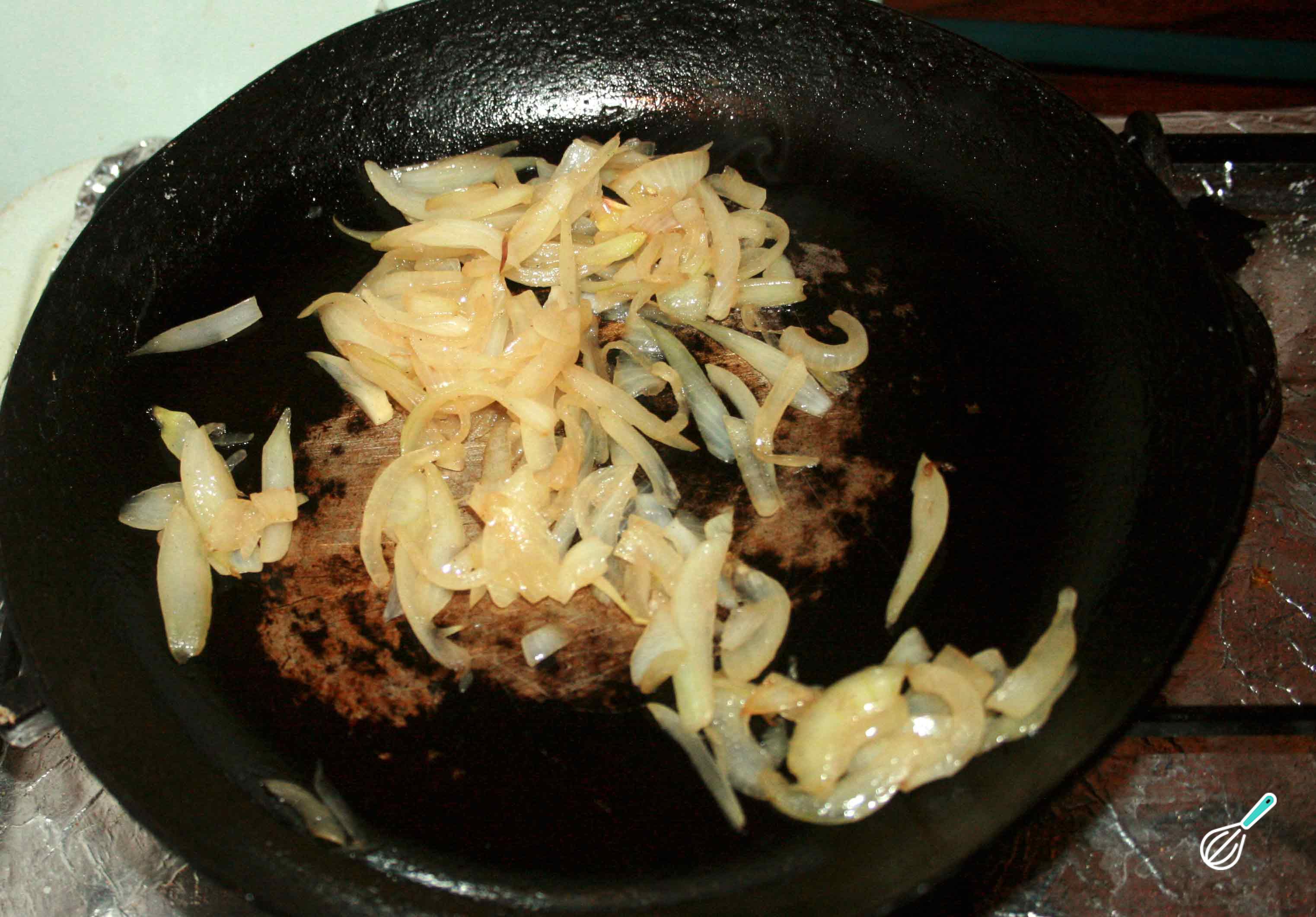 Comece esta receita de almôndegas de frango com molho de tomate, por picar a cebola muito finamente. Pré-aqueça uma frigideira com seis colheres de azeite. Coloque as cebolas e um pouco de sal a gosto e deixe cozinhar em fogo baixo por 20 minutos, mexendo ocasionalmente até a cebola caramelizar.