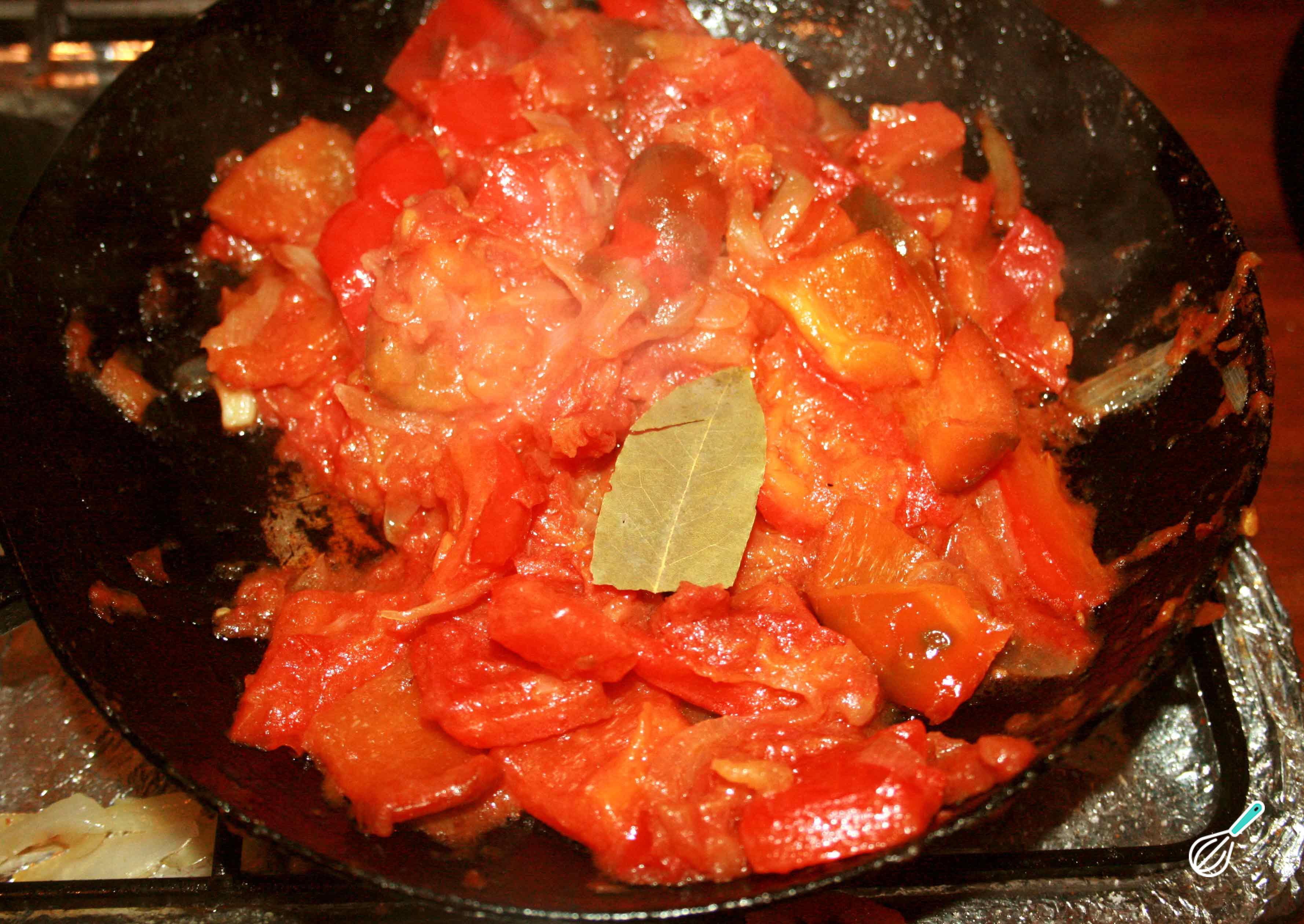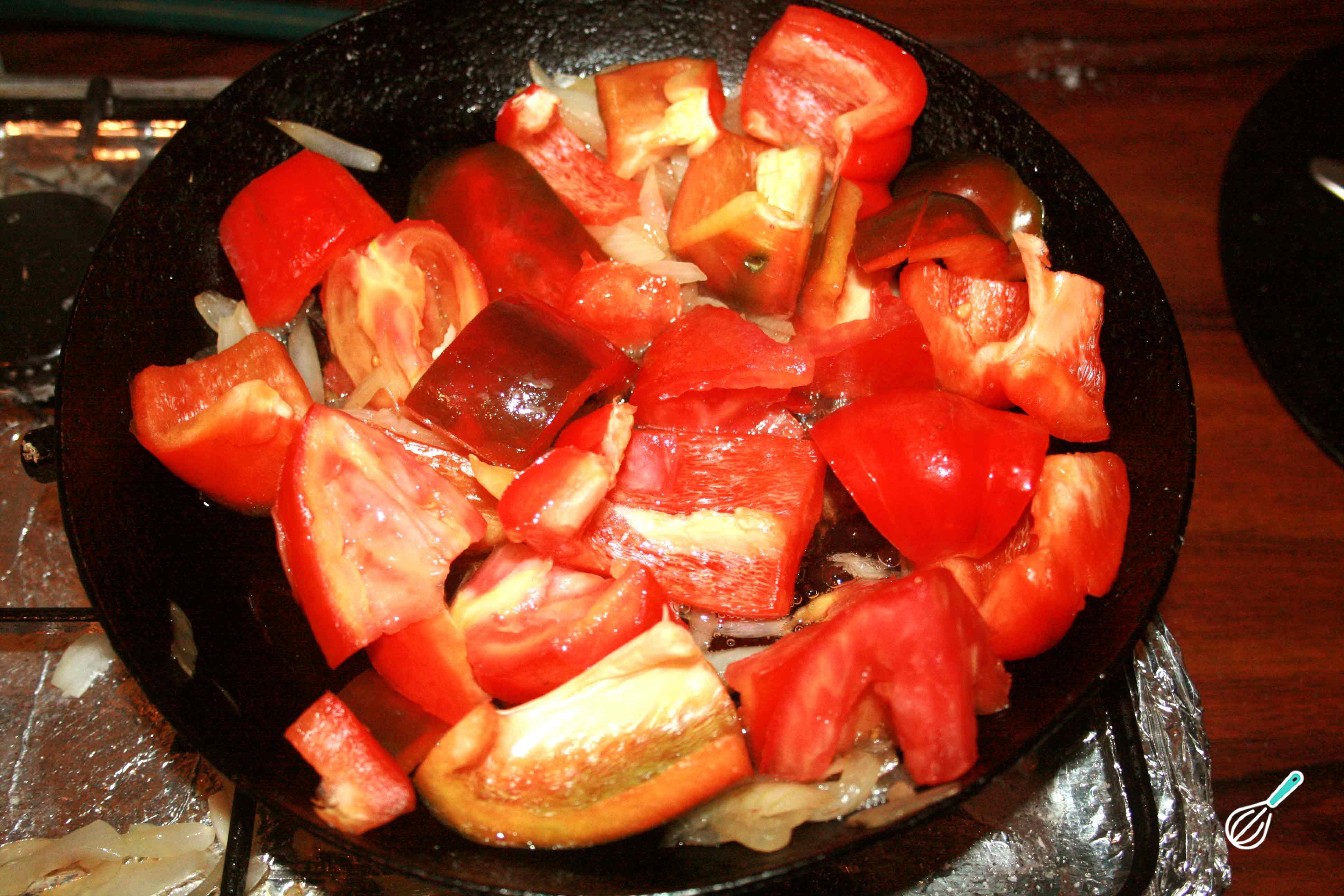 Lave muito bem, os vegetais e de seguida corte os tomates e os pimentões em pedaços. Adicione-os agora à frigideira e cozinhe em fogo alto, até todos os ingredientes estarem bem incrementados.