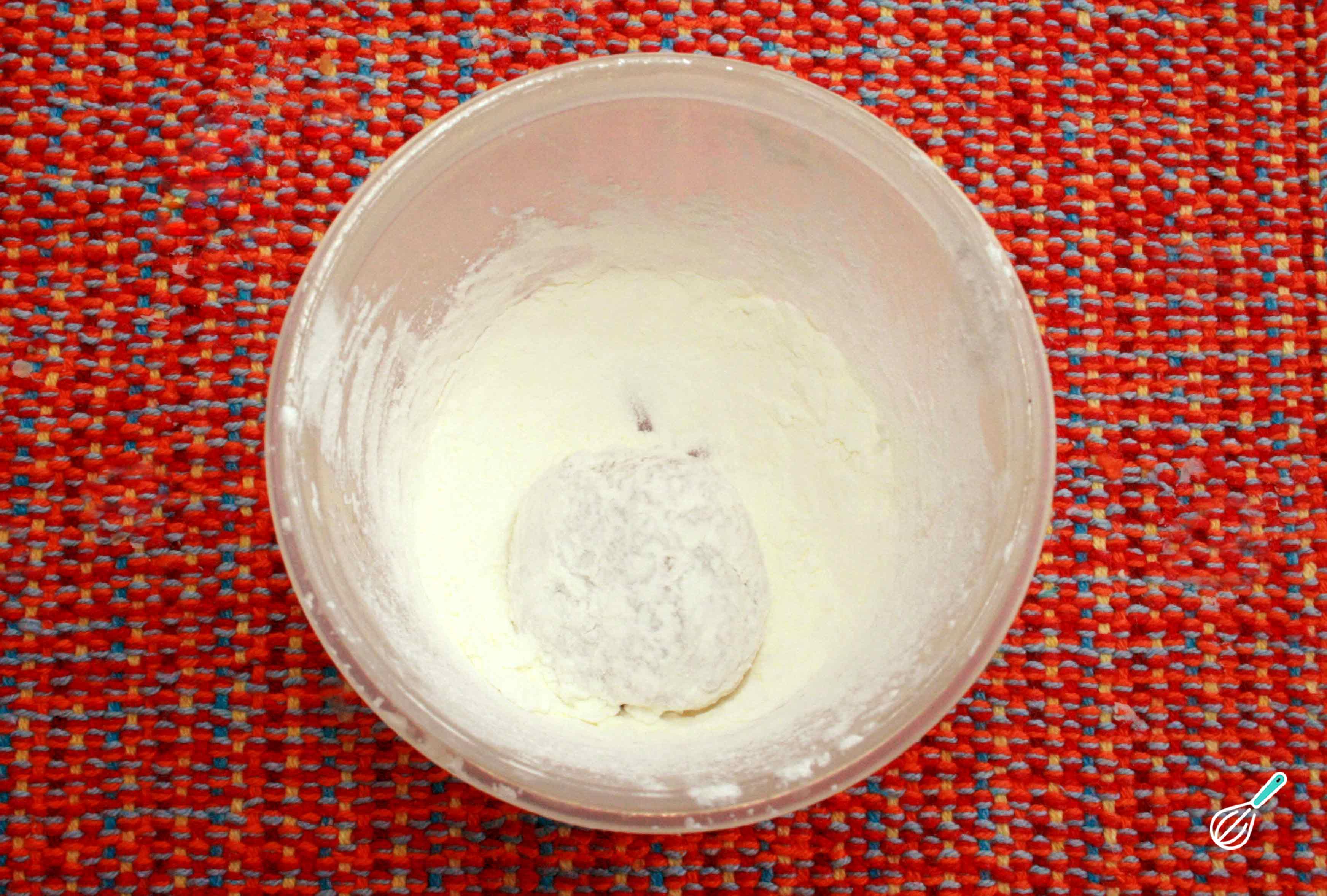Em uma taça coloque farinha e depois das bolas formadas, passe-as pela farinha.