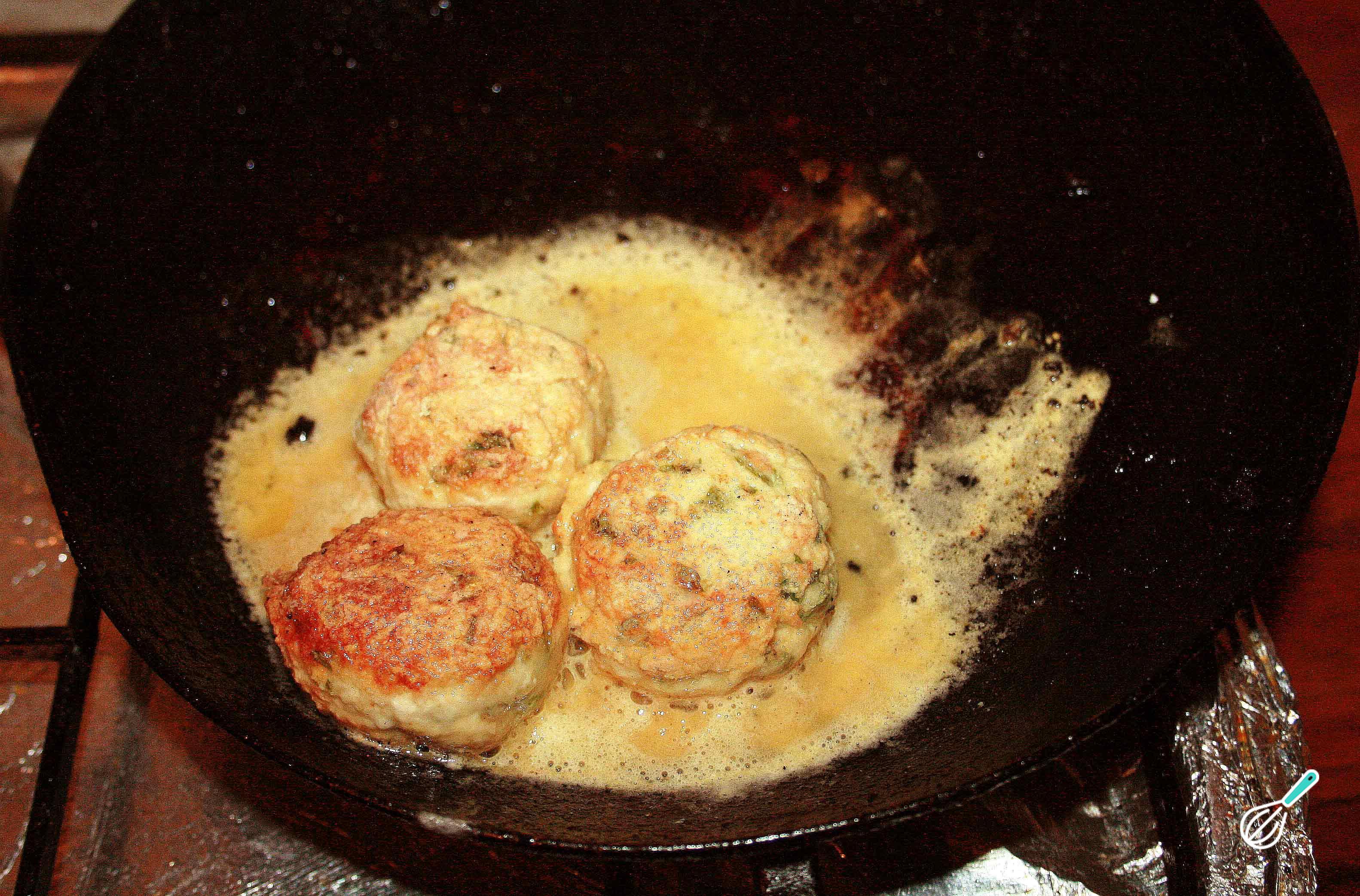 Pré-aqueça uma frigideira com azeite e frite as almôndegas, até que estas fiquem douradas.