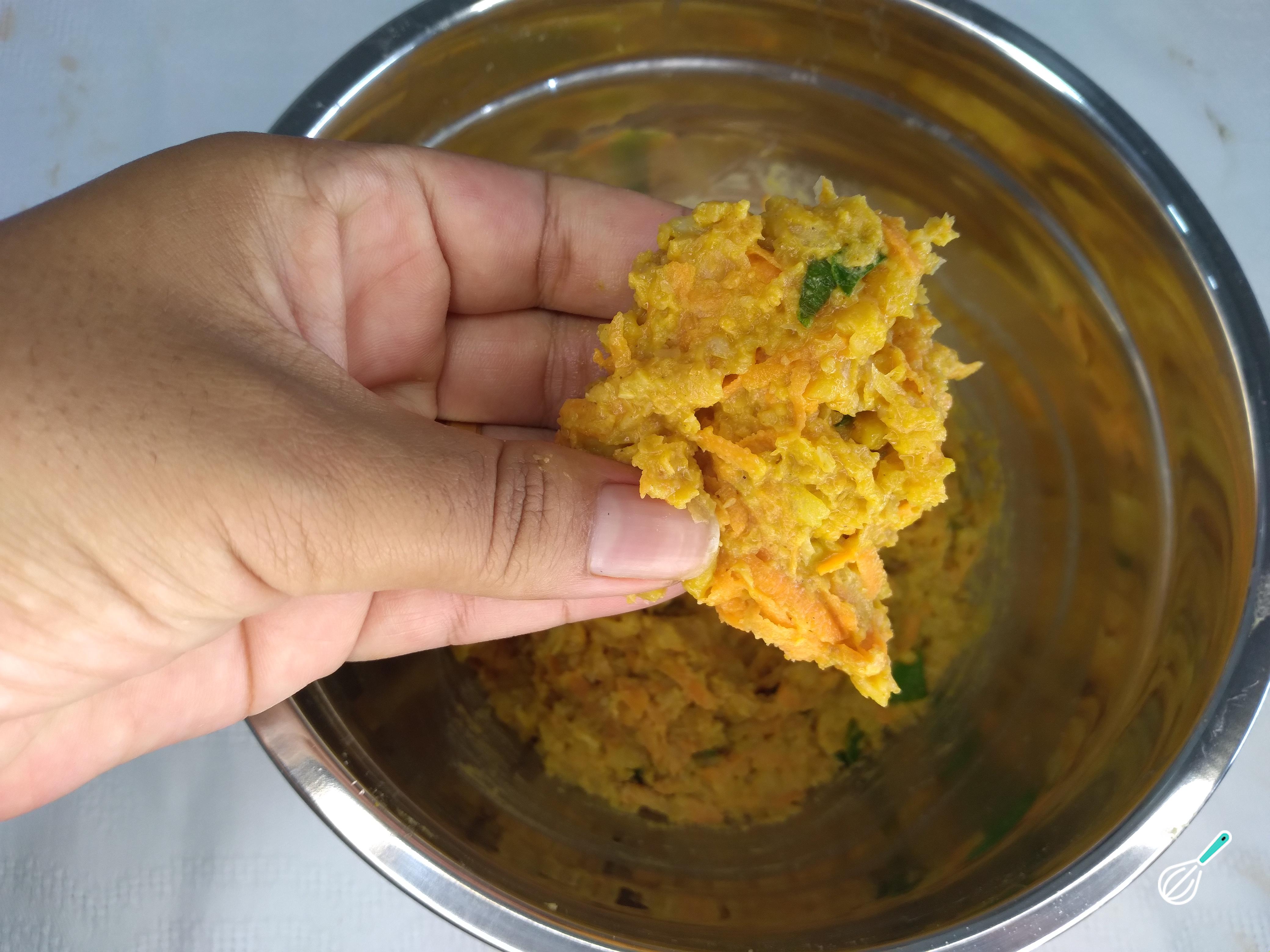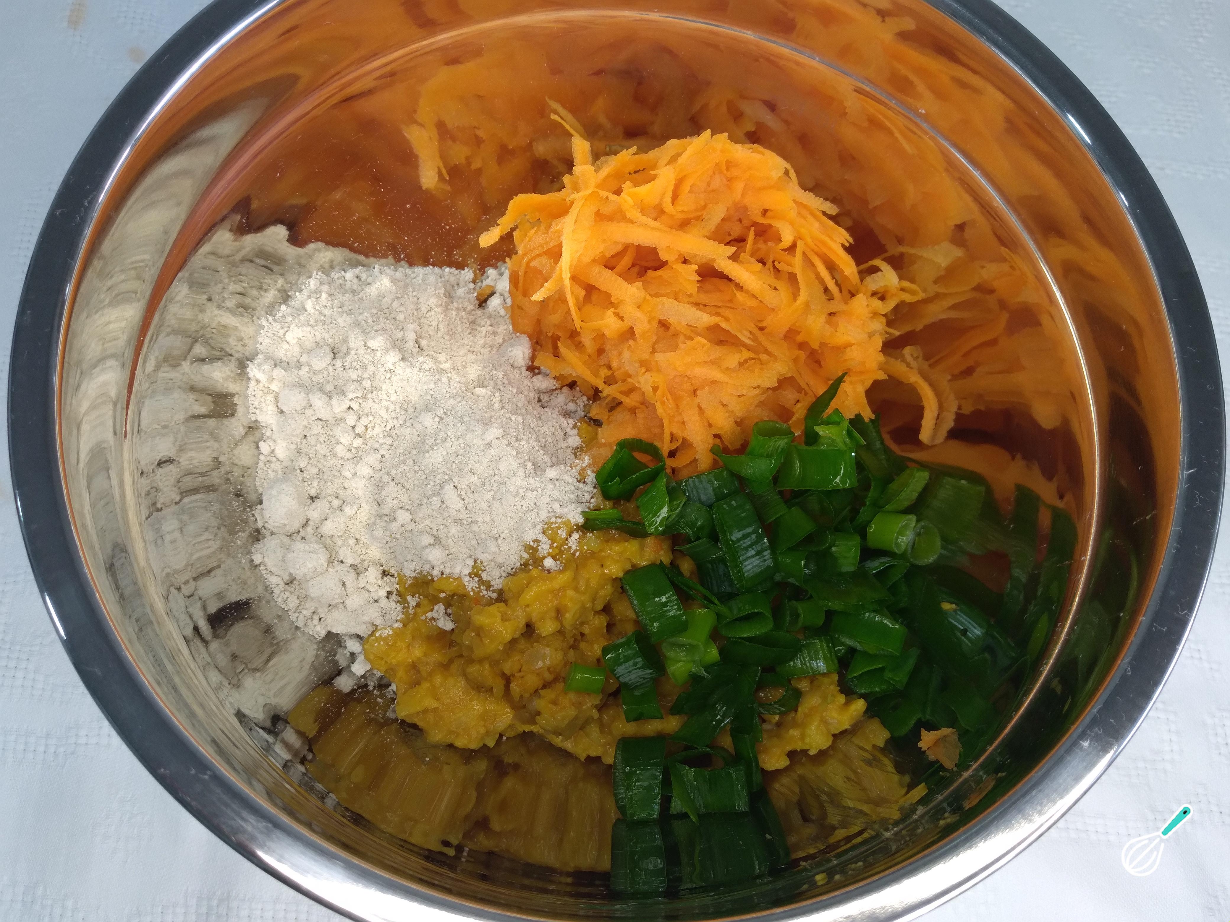 Em um bowl, coloque a pasta de grão de bico e acrescente a cenoura ralada, a cebolinha verde e a farinha de aveia. Usando as mãos, misture tudo muito bem para ficar bem misturadinho e incorporar os sabores.