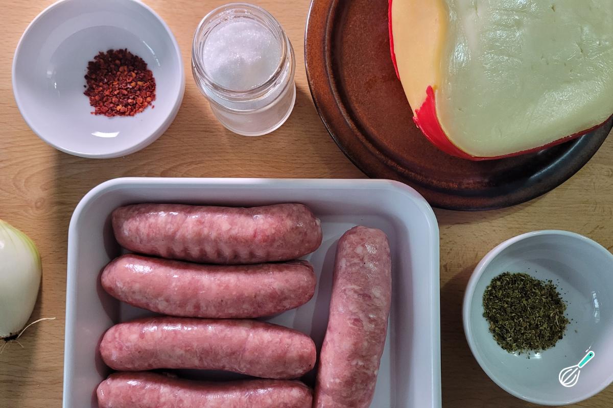 Separe os ingredientes para fazer suas almôndegas de linguiça. Se preferir, você também pode fazer uma mistura da carne moída que preferir e linguiça. Use os temperos que preferir. Você também pode usar queijo muçarela ou queijo prato no lugar do queijo bola.