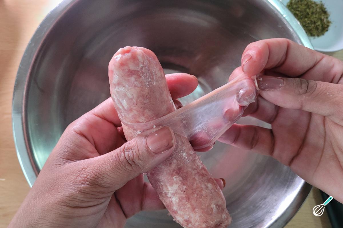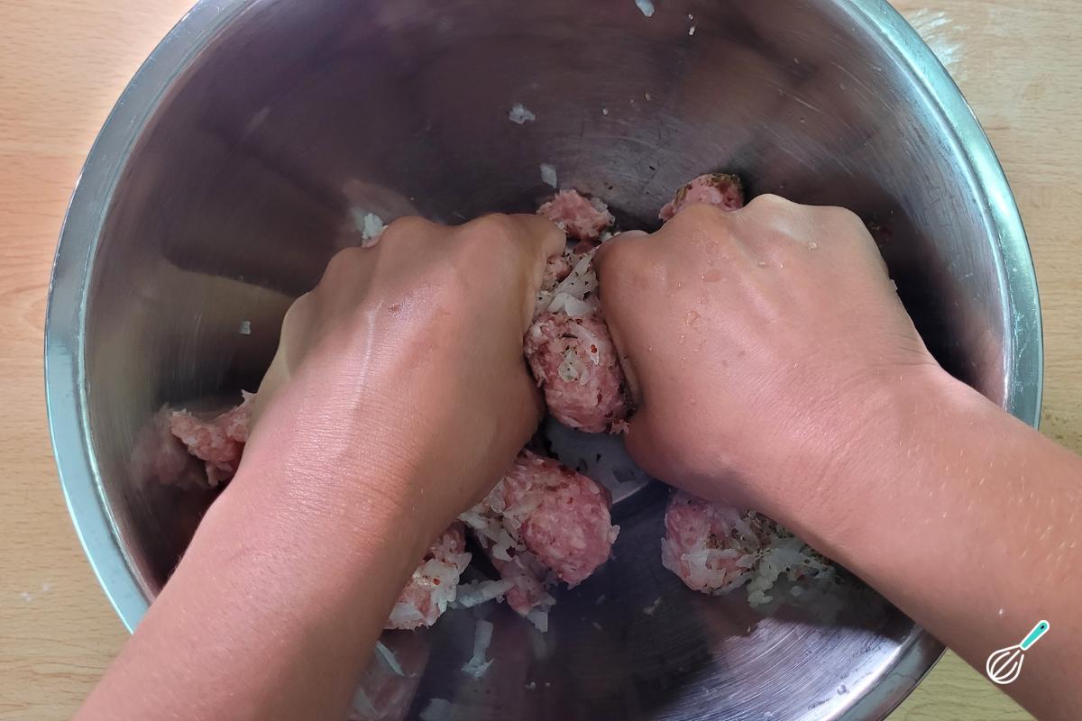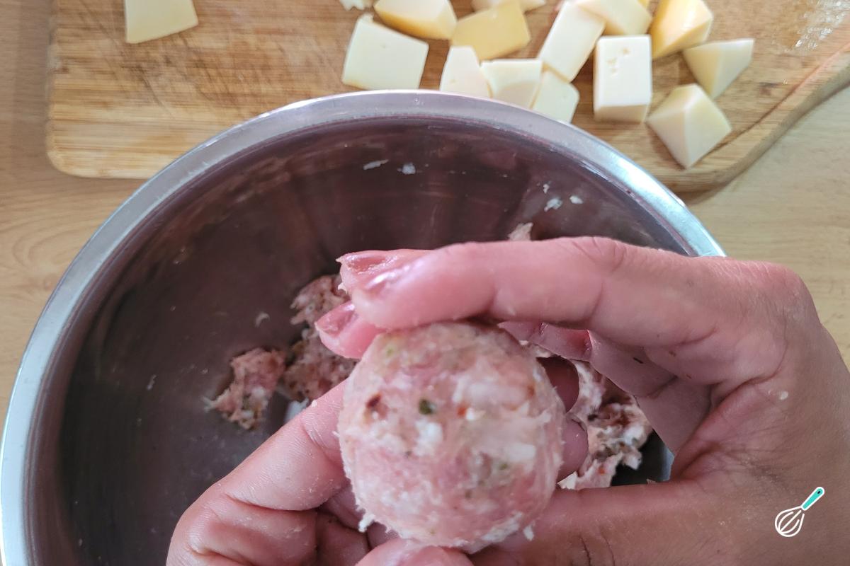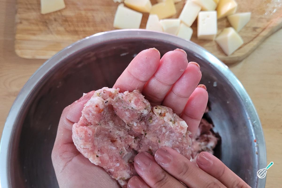 Vá pegando porções da mistura de linguiça e abra na palma da mão. Faça as almôndegas do tamanho que preferir. Quanto maiores as almôndegas, mais tempo elas precisarão para cozinhar por dentro na airfryer.